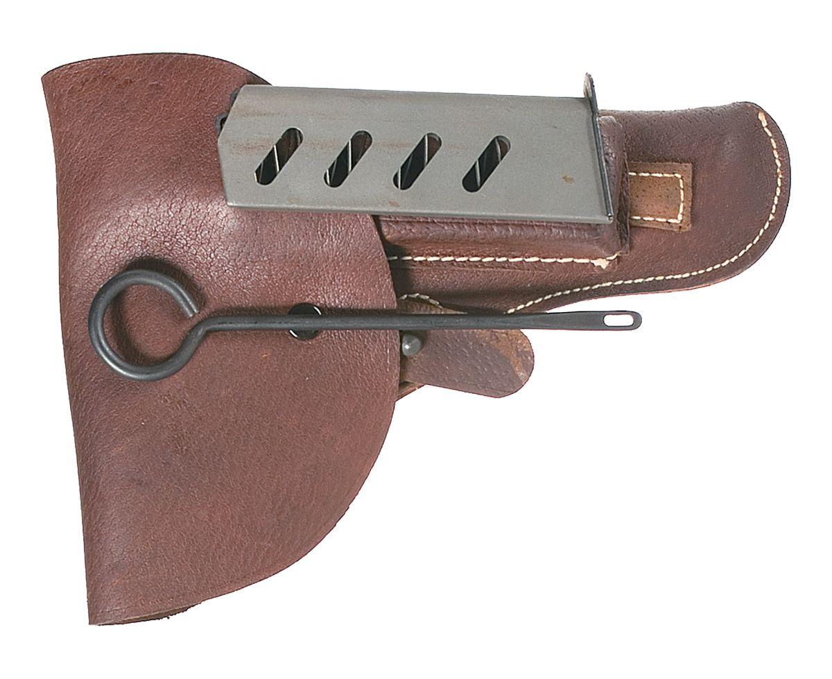 A) Serial number marked on matte rib, left side of frame and on barrel. Right side of frame marked with "CAI" import markings and "CZECH (crossed swords) 53 7.62 Tok". Complete with brown leather holster, extra magazine, cleaning rod and lanyard.