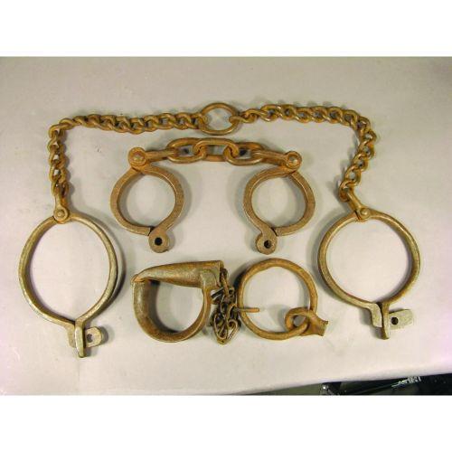Three Sets of Early Leg Irons, two padlock and one anchor style. Various sizes and conditions.