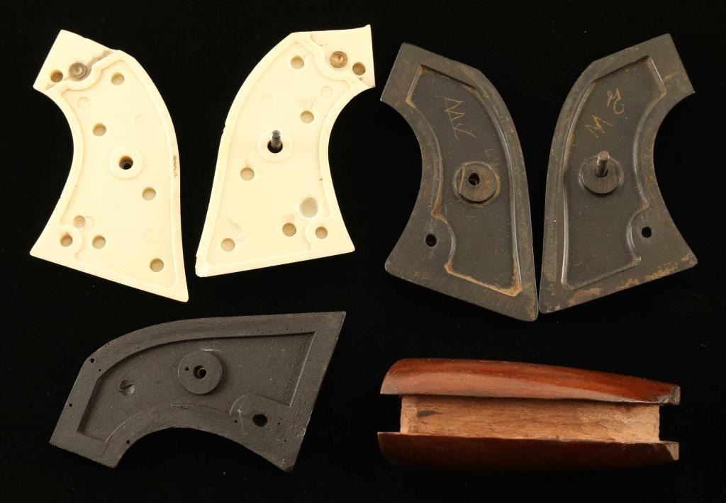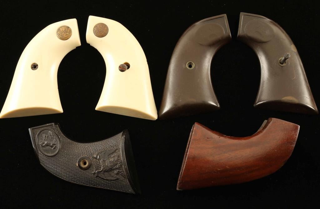 Includes: One-piece wood Colt SAA type(repaired/modified), two-piece First Gen Colt SAA hard rubber grips(worn smooth), a right side Colt SAA federal eagle grip, and a set of faux-ivory plastic grips with Hi-Standard medallions.