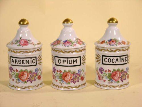 Three Sevres porcelain apothecary jars/late 1800's France/hand painted/Co. in business since 1700's, ARSENIC/OPIUM/COCAINE.