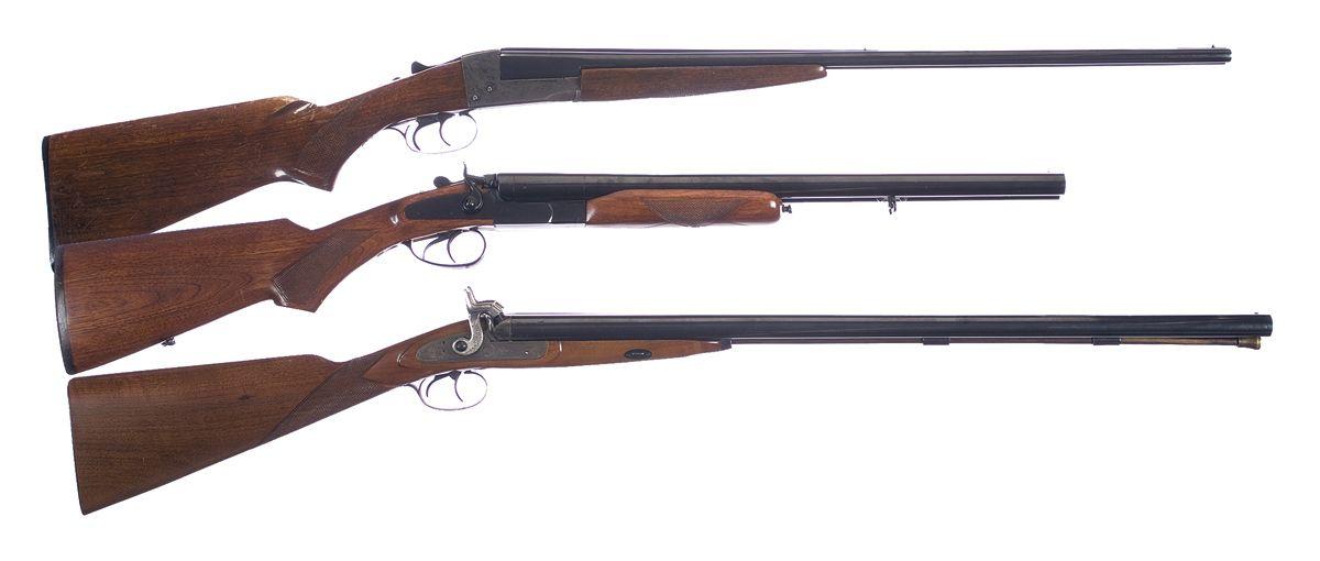 B) Single bead sight on solid rib, marked "FULL CHOKE", 3" chambers. Double hammers and triggers. Checkered beaver tail forearm and pistol grip stock