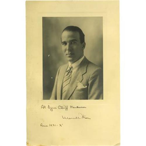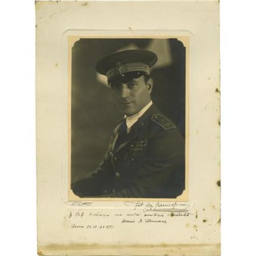<B>Three Signed Photographs of Italian Aviators,</B></I> the first, 9.75” x 13.5”, being of Mario De Bernardi (1893 - 1959) and inscribed to aviation entrepreneur Cliff Henderson; the second, 10” x 14”, a profile of Italo Balbo (1896 - 1940) simply inscribed with his name, and the third, 11” x 17”, unknown with illegible signature, but inscribed to Cliff Henderson. Various degrees of soiling to mats, some chips on third image. Overall very good condition. <I>From the collection of Cliff Henderson.</B></I><BR><BR><b>Shipping:</b> Flat Material, Large (<a target="_blank" href="http://www.heritageauctions.com/common/shipping.php">view shipping information</a>)