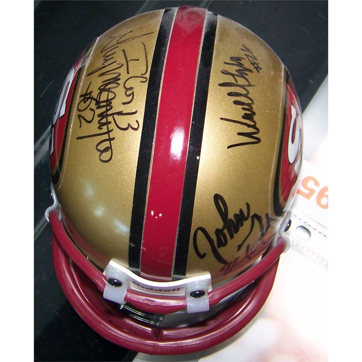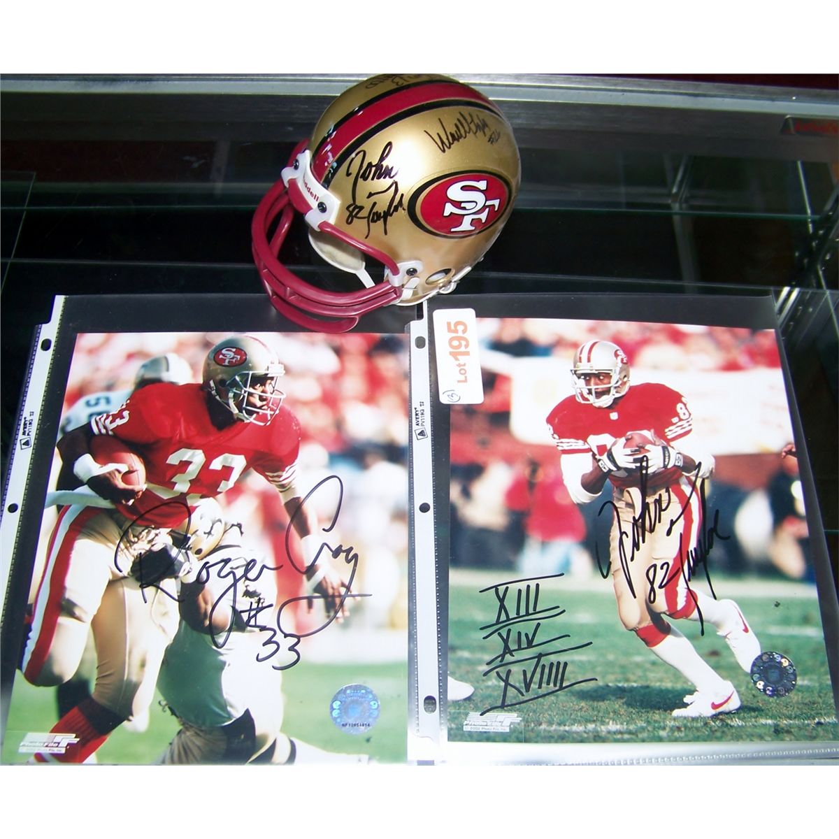 Roger Craig and John Taylor signed Pics and a Mini Helmet Signed by John Taylor, Guy McIntyre, and one other.