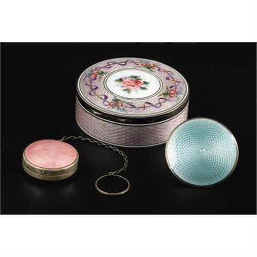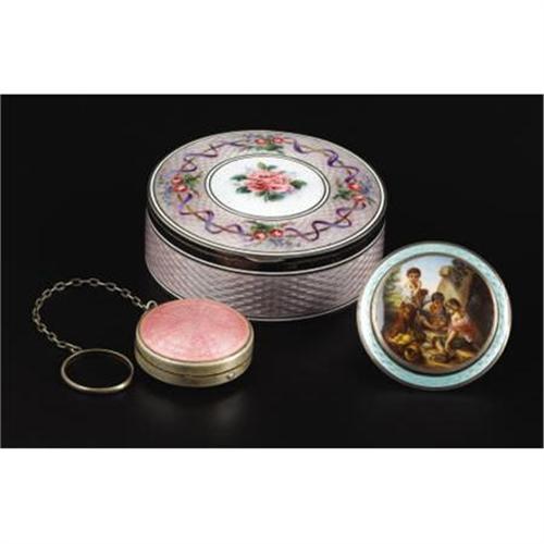 <B>Three Small French Enamel and Silver Powder Boxes<BR></B></I>Various makers <BR>Nineteenth Century<BR>Various materials<BR>First stamped <I>935</B></I>, Second stamped <I>Made in Austria 935, Sterling HASS <BR></B></I>3.25 inches in diameter (largest)<BR> <BR>The largest decorated with a rose and beribboned thorn scroll enameled in lavender, pink and green on an engine turned ground. The second an Austrian silver and enamel powder box decorated with peasant boys after Murillo, the bottom enameled in mint green. The third a hinged box in pink enamel over engine turnings. <B>Condition Report:</B> Second box with broken hinge.<BR><BR><b>Shipping:</b> Miscellaneous Collectibles, Smal (<a target="_blank" href="http://www.heritageauctions.com/common/shipping.php">view shipping information</a>)
