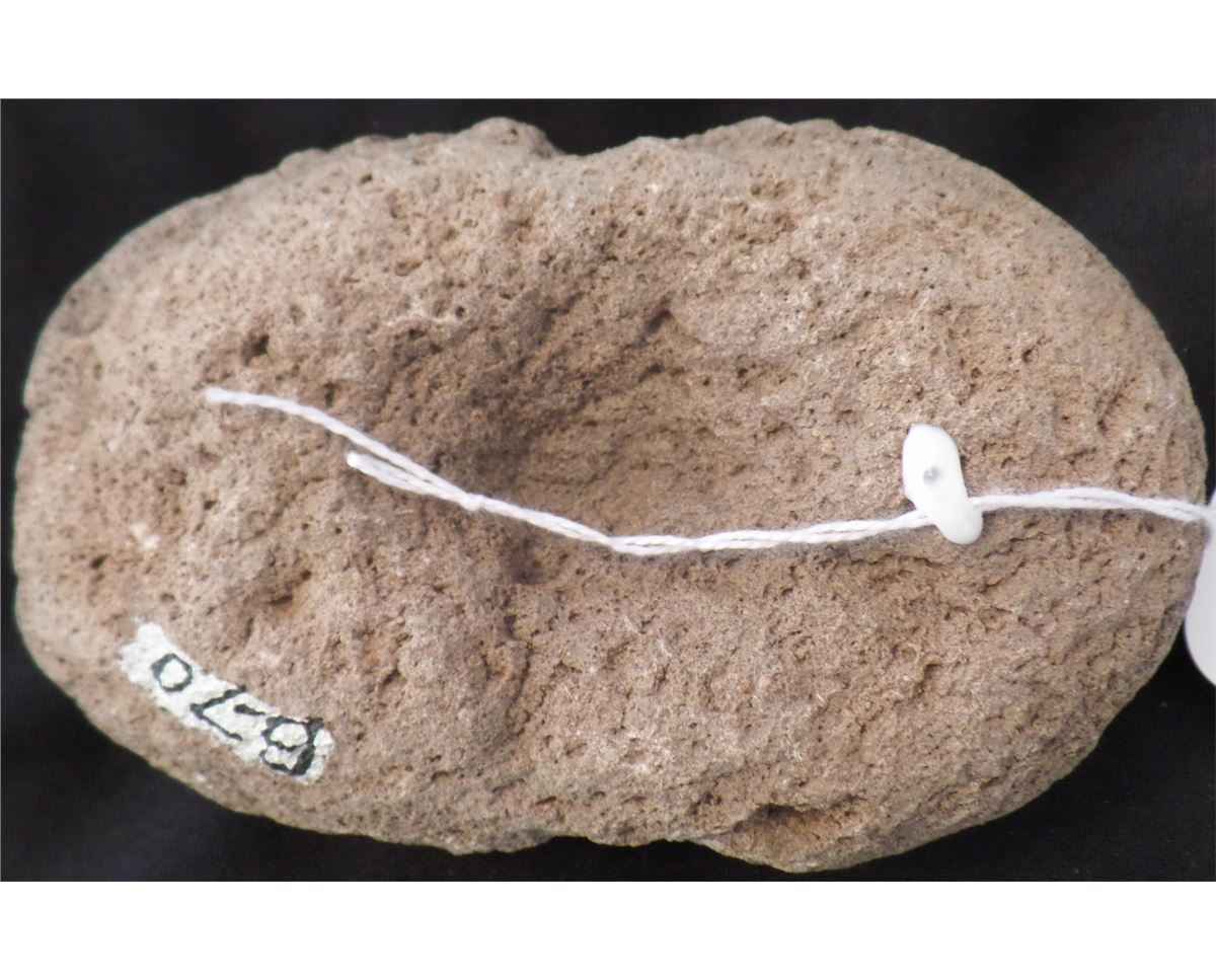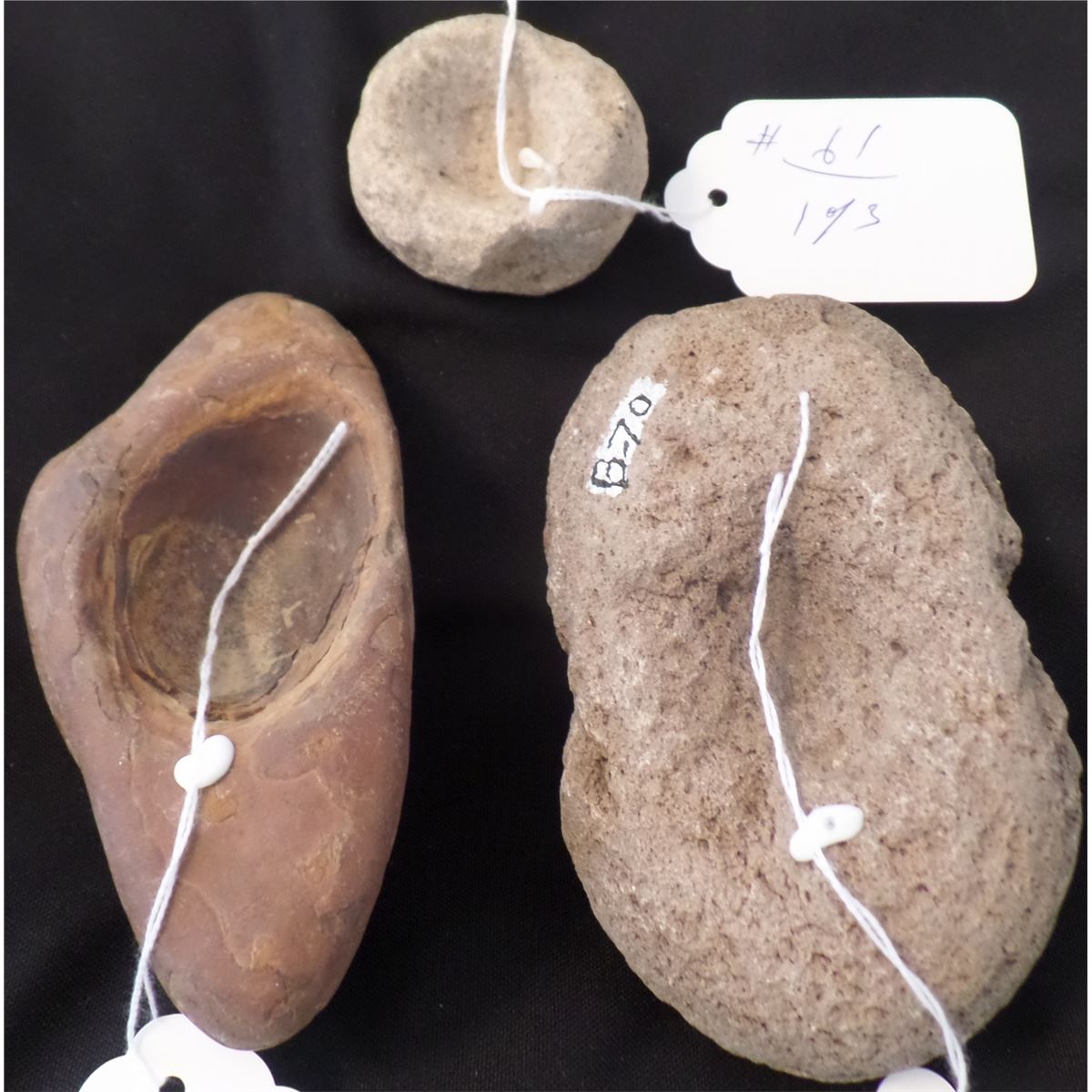Anasazi three small mortars made from sandstone. The Largest Mortar is a double cup. The mortars measures 3 x 5 inches and 2 x 1 inches. They are as found. Shipping Cost: $20.00
