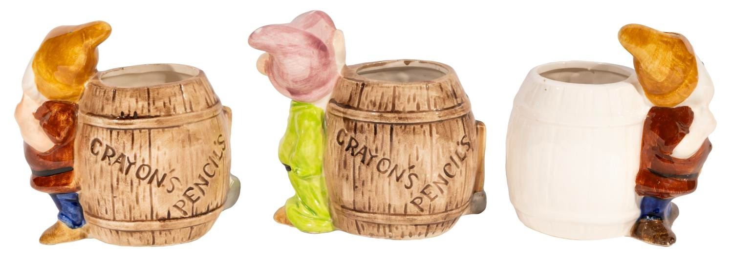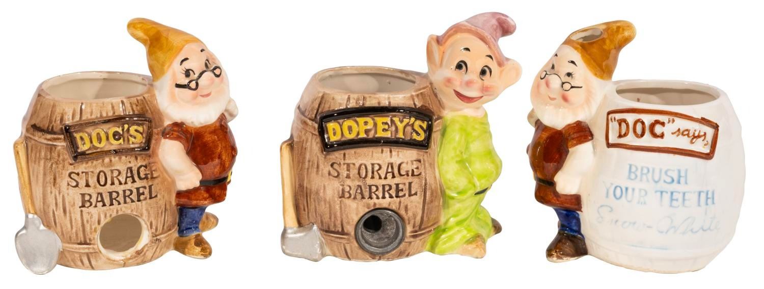 (Enesco, 1950s-60s) Three “Snow White and the Seven Dwarfs” hand-painted ceramics. Included is a Dopey pencil holder with a sharpener, a Doc pencil holder, and a Doc toothbrush holder. Measuring 4.5" tall and 5" wide to 4.5" tall and 4.25" wide, each piece is in fair-to-good condition, with discoloration, scuffs, wear, and crazing to the glaze of each one, a missing sharpener to the Doc, and the Dopey exhibiting a crack along its barrel.