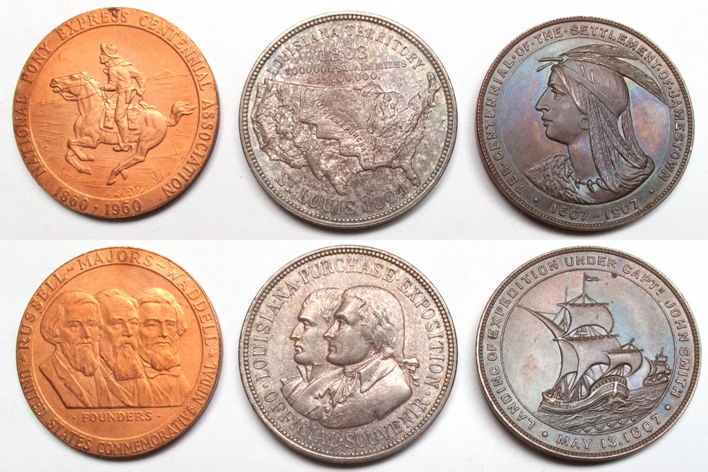 1) Louisiana Purchase. Scarce St. Louis exposition coin. Silver. 2) Jamestown Tercentennial, bronze, 3) 1) Official Bronze Medal of the National Pony Express Centennial Association. So-called dollar featuring the 'big three' of the Pony Express, Uncirculated and in original envelope. HK 583.City: County: State: Date: