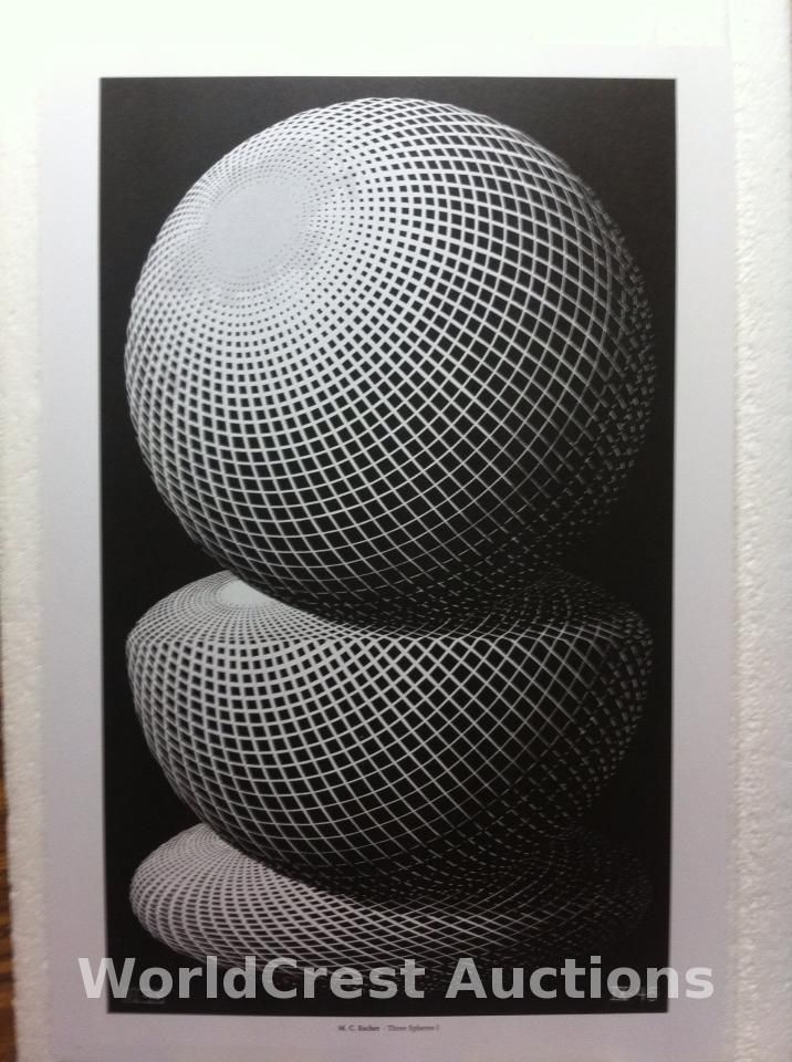 M. C. Escher Three Spheres I, 1945 Lithograph "At the top of the print the spatial nature of the globe is brought out as strongly as possible. Yet it is not a globe at all, merely the projection of one on a piece of paper which could be cut out as a disc." M. C. Escher