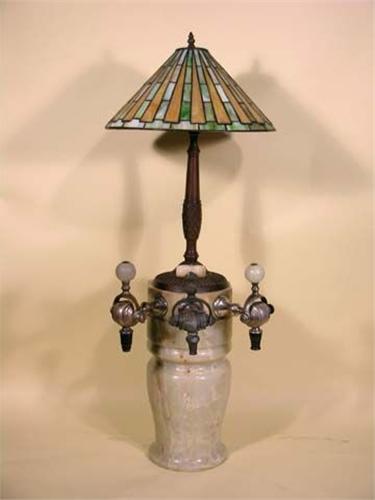 Three spigot marble soda dispenser with leaded glass lamp. Ex cond. Lamp not original to dispenser.