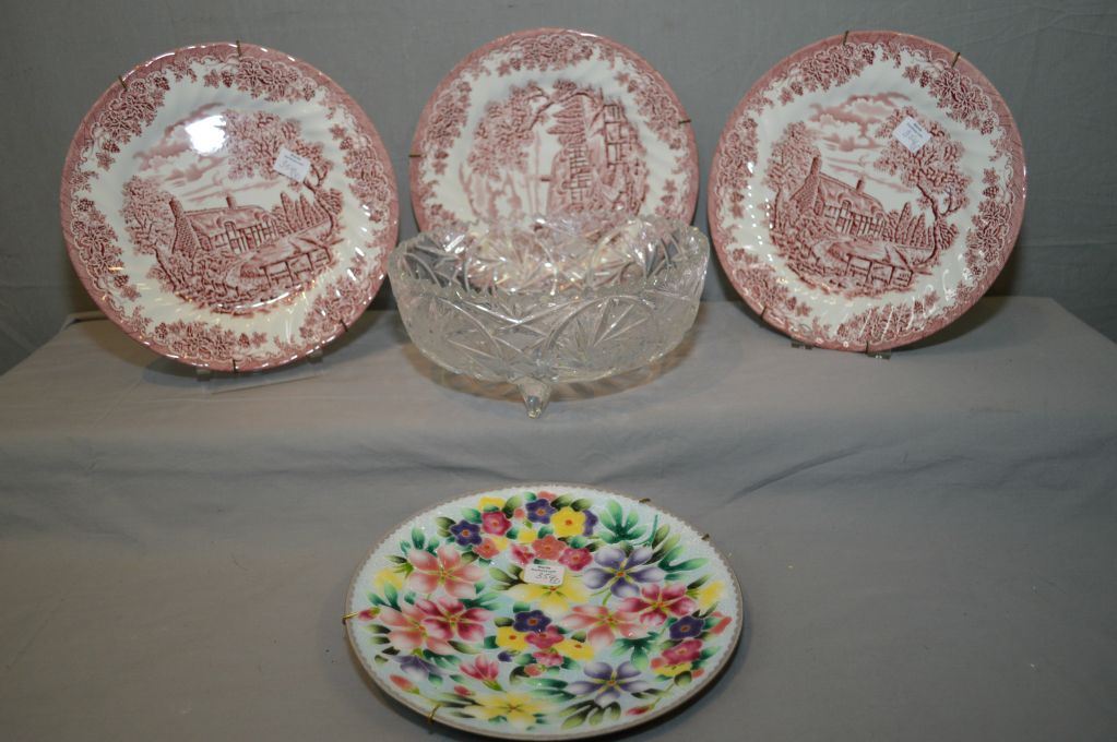 Three Staffordshire plates, an enamel plate and a footed crystal bowl