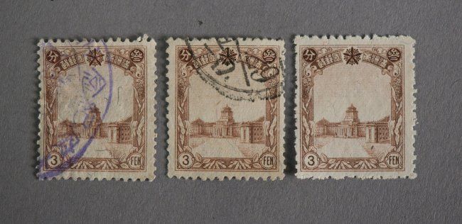 Three "3 cents" Chinese stamps, Man Ord.5 4th Print Ordinary Issue, with postmarks, 1936.12.5-1937.4.1; 18.5 mm x 22.5 mm; Provenance: private Canadian collector