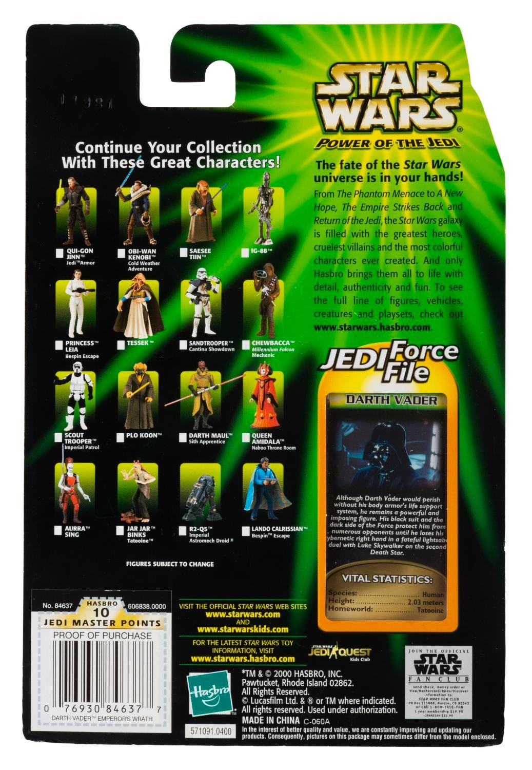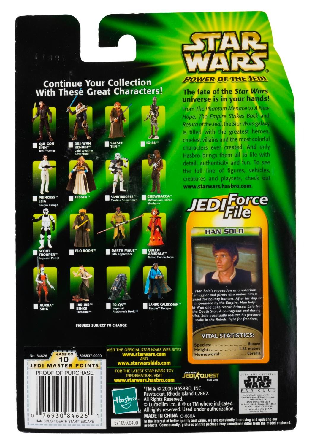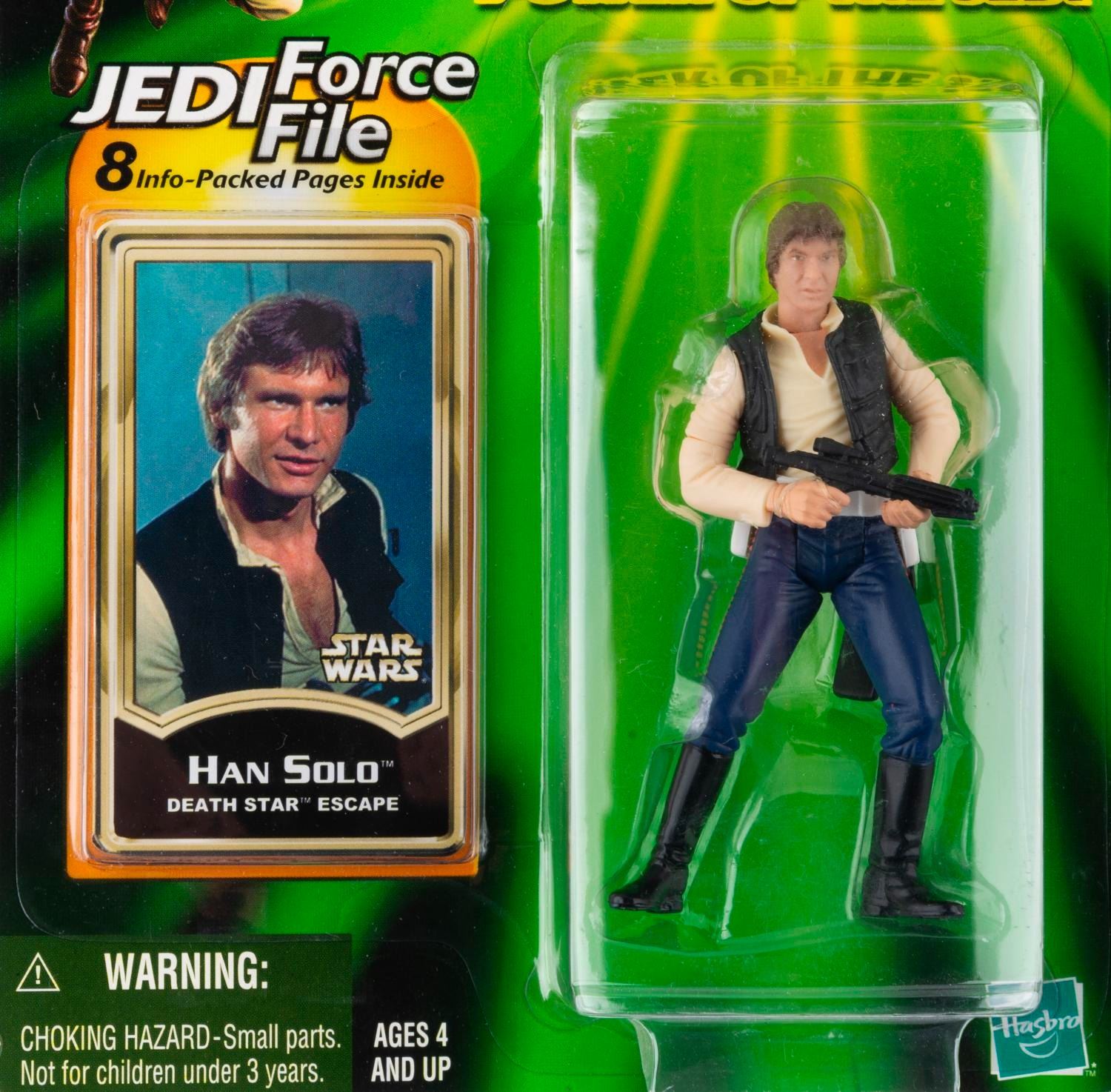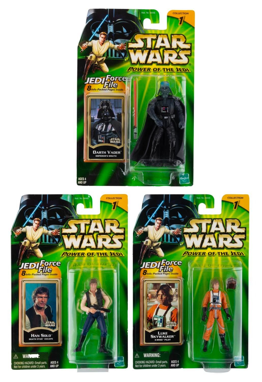 (Hasbro, 2000) Three Star Wars Power of the Jedi Collection 1 action figures, including Luke Skywalker, Han Solo, and Darth Vader, each with a Jedi Force File 8-page packet. Ranging in size from 3.25” x 4.25” tall each, the figures are in fine condition on their original cards, which exhibit light scratches and wear.
