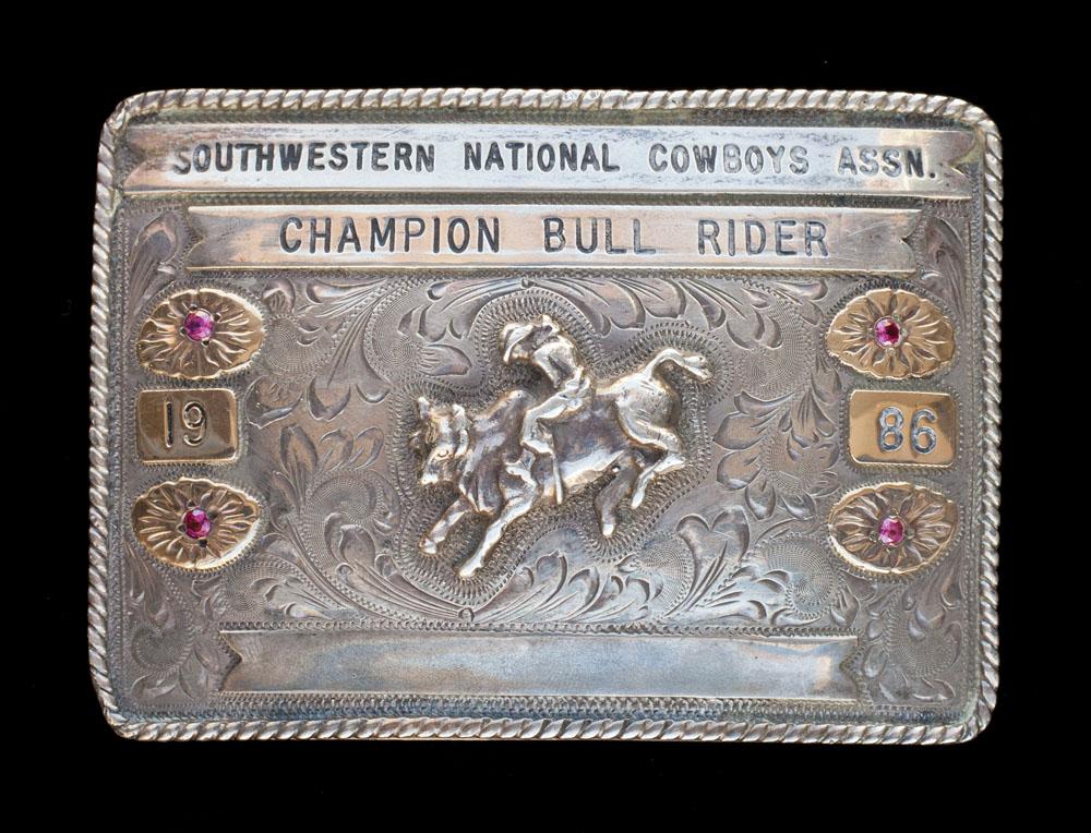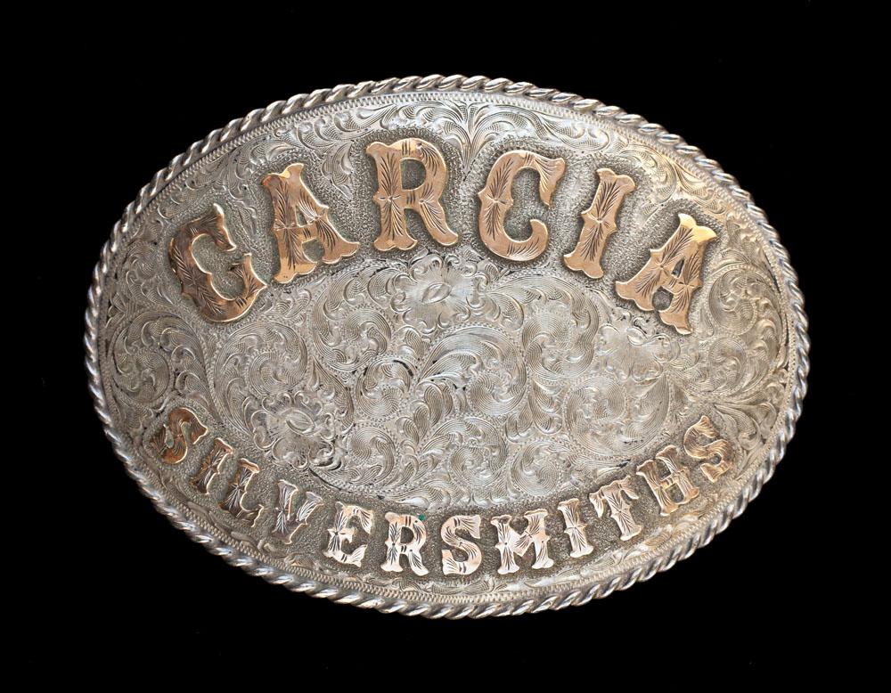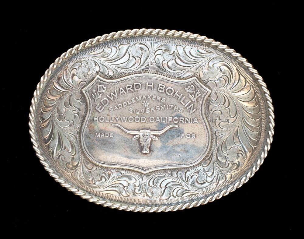 (a) Edward H. Bohlin, Hollywood Calif sterling oval with rope edge and saddle plate; (b) 1986 Champion Bull Rider sterling & 10K; (c) Oval Garcia Silversmiths marked Mexico / sterling & 10K.