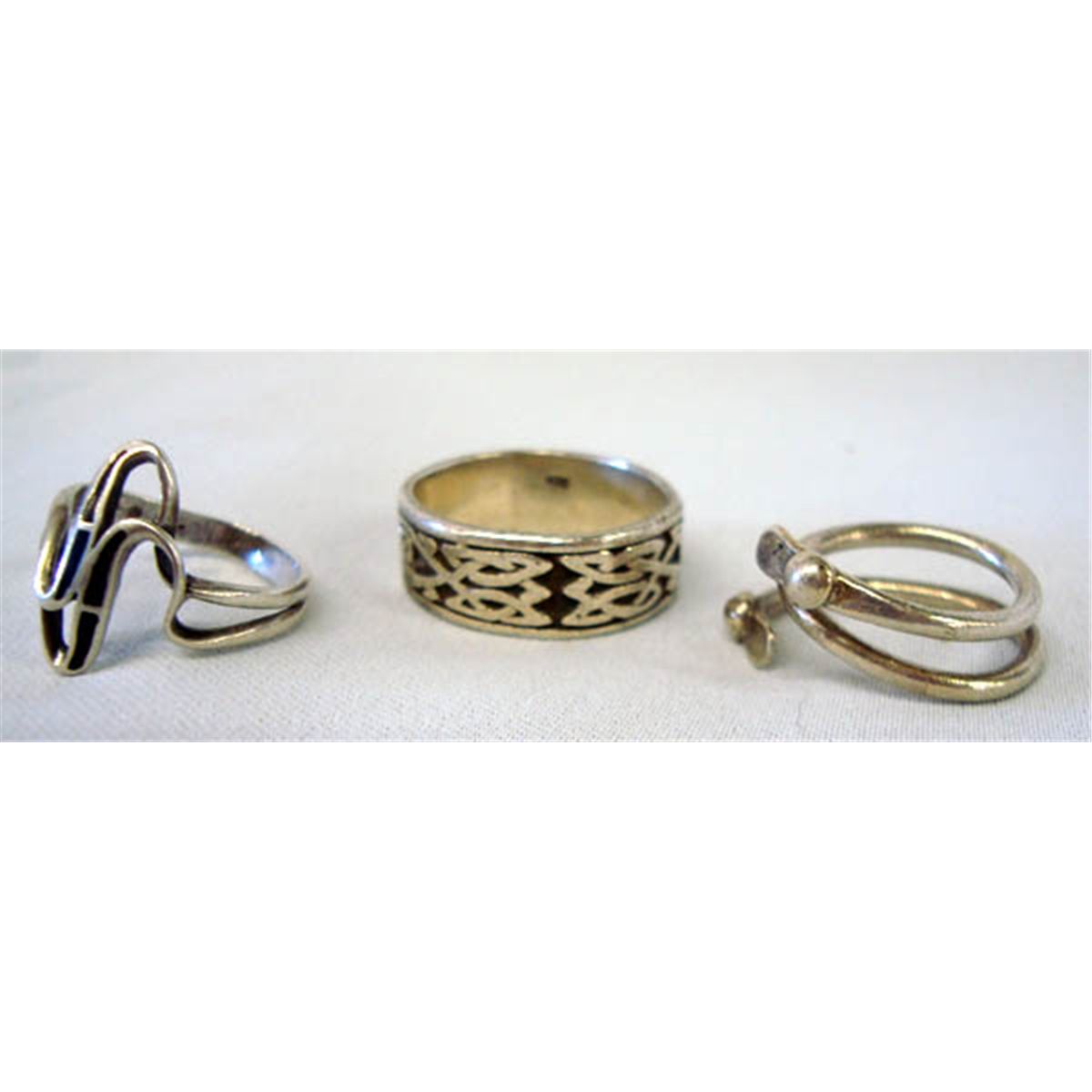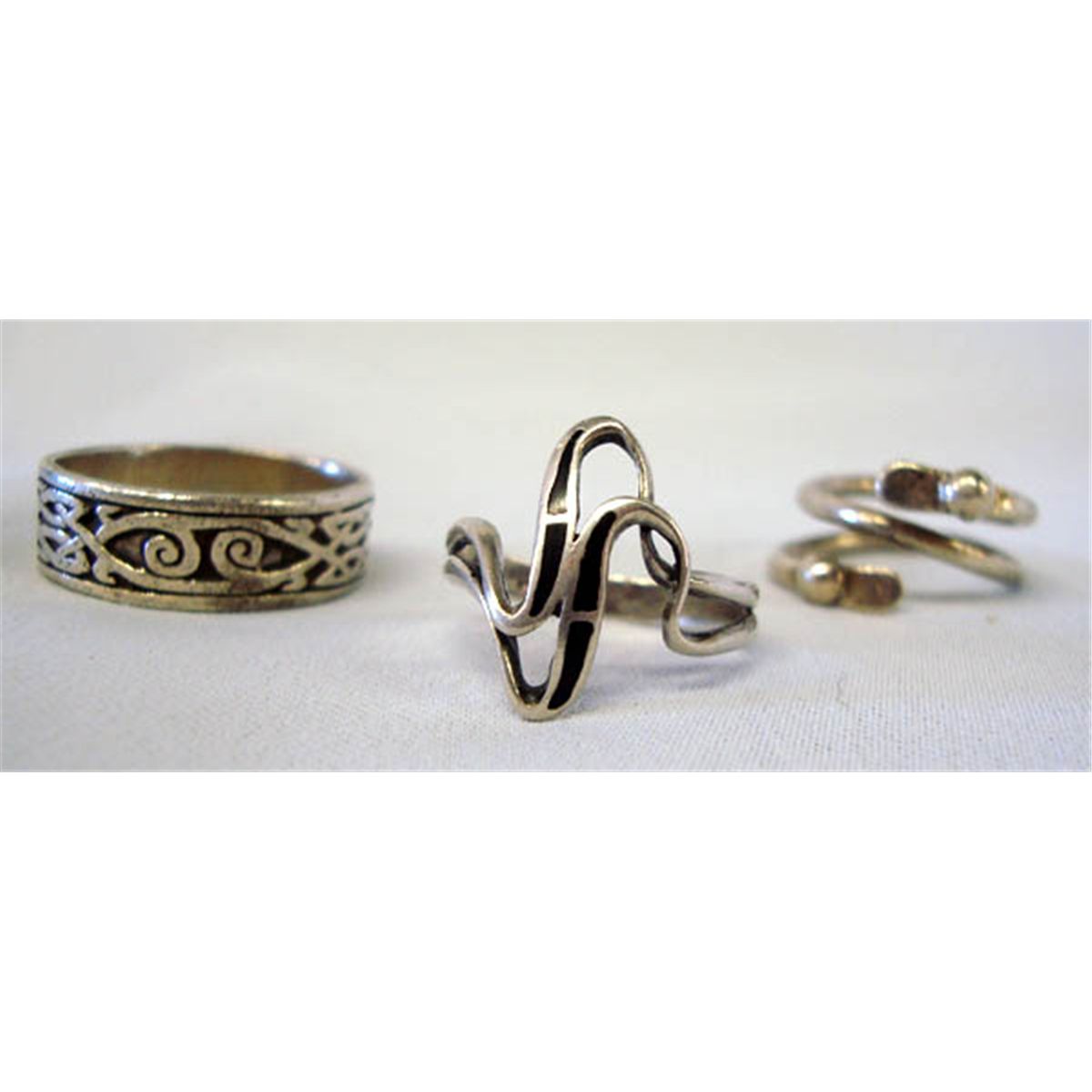 Three sterling rings. Largest band is stamped 925 and is size 12; The double front designed ring is size 7.5; the wrap around sterling ring band is size 5.5 and is adjustable. Buyers Pay Actual Shipping and Handling Charges(see terms and conditions for more information)
