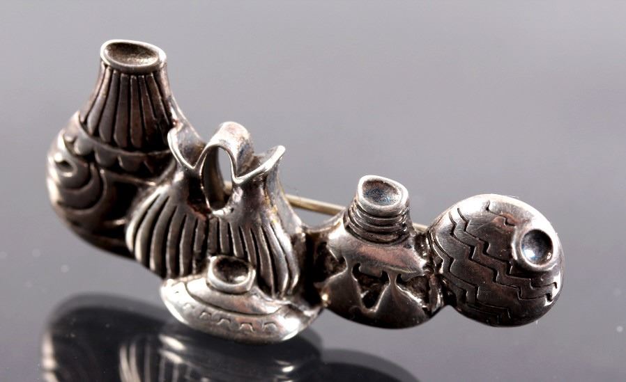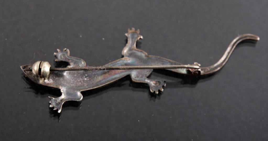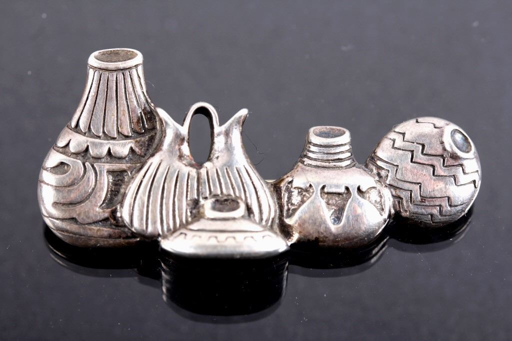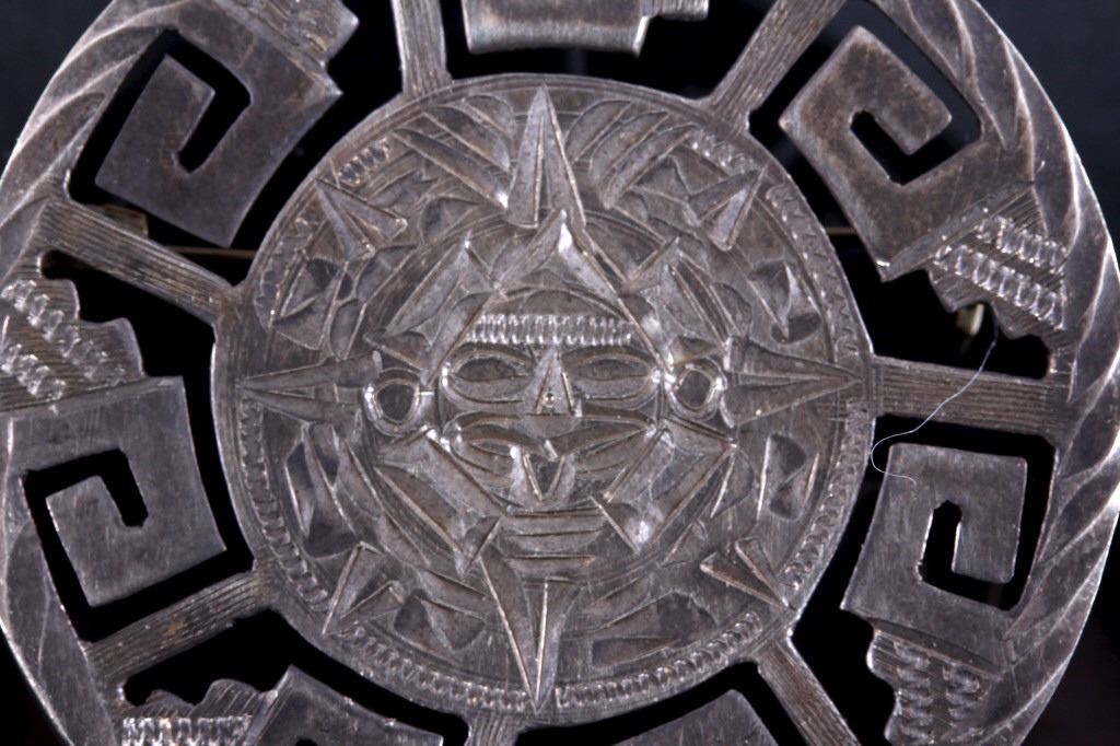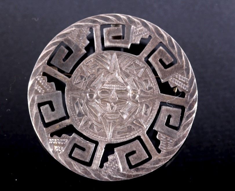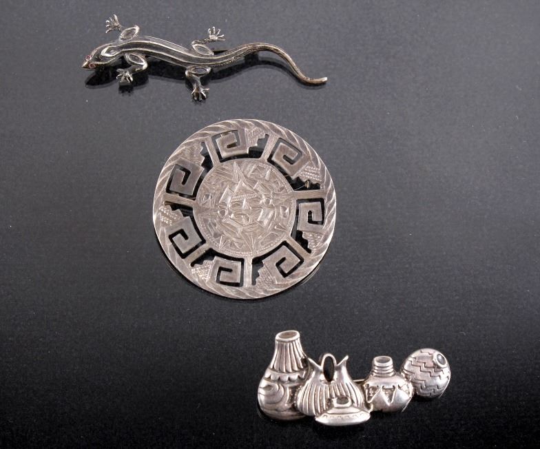 This lot features three brooches believed to be Sterling Silver. The first is a silver hand etched brooch or pendant with an Aztec warrior face in the center surrounded by a cut-out design. The back is marked "Hecho En Mexico/ 925/ IV" and has the "Eagle" form mark stamped with "79" on the breast. This Eagle mark was used from the mid 1950's through the 70's or 80's. The number likely refers to a city or silver manufacturing Company. It measures about 1 3/4" in diameter. The second brooch is a gecko having ruby red colored stone eyes and measuring 2.5" long. It is unmarked, but believed to be silver (untested). The third brooch is a Navajo sand cast silver and depicts five Navajo pots cleverly cast to look 3D. The brooch is unmarked, but an identical brooch found online is marked "Sterling" and has a hallmark for Thomas Singer. According to PuebloDirect.com, Tommy Singer (1940-2014) was a world famous Navajo Silversmith and had pioneered the technique of chip inlay while he was working with scrap turquoise stones. While this brooch has no inlay work, it does feature detailed design. The brooch measures 2" long by 1" tall. All three brooches are in very good condition.