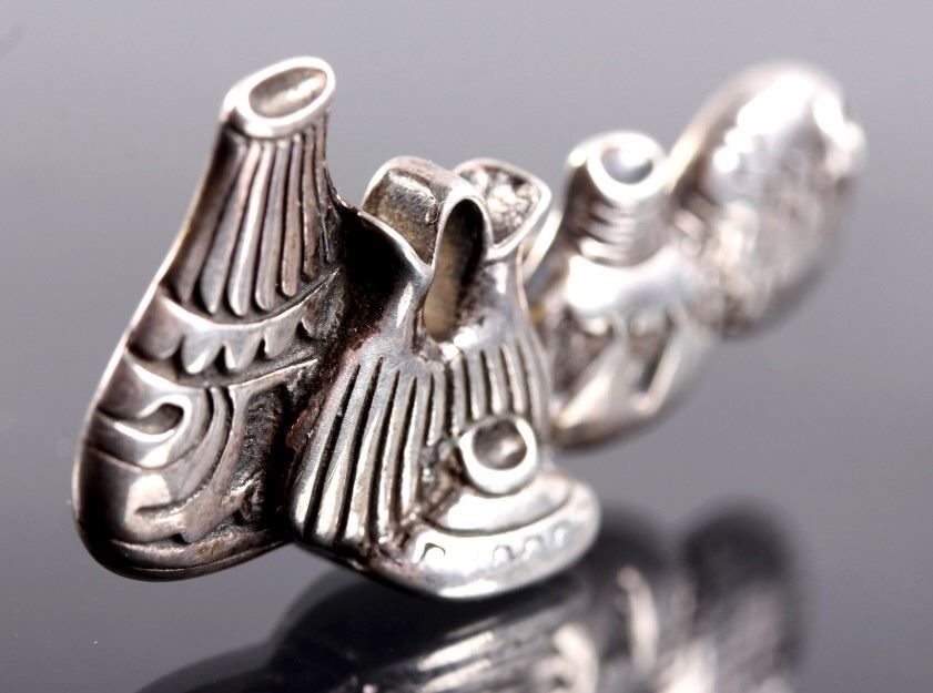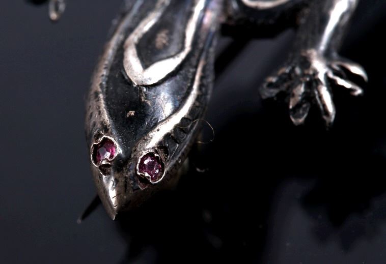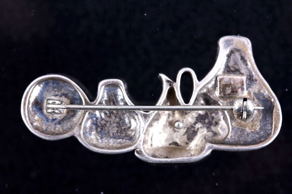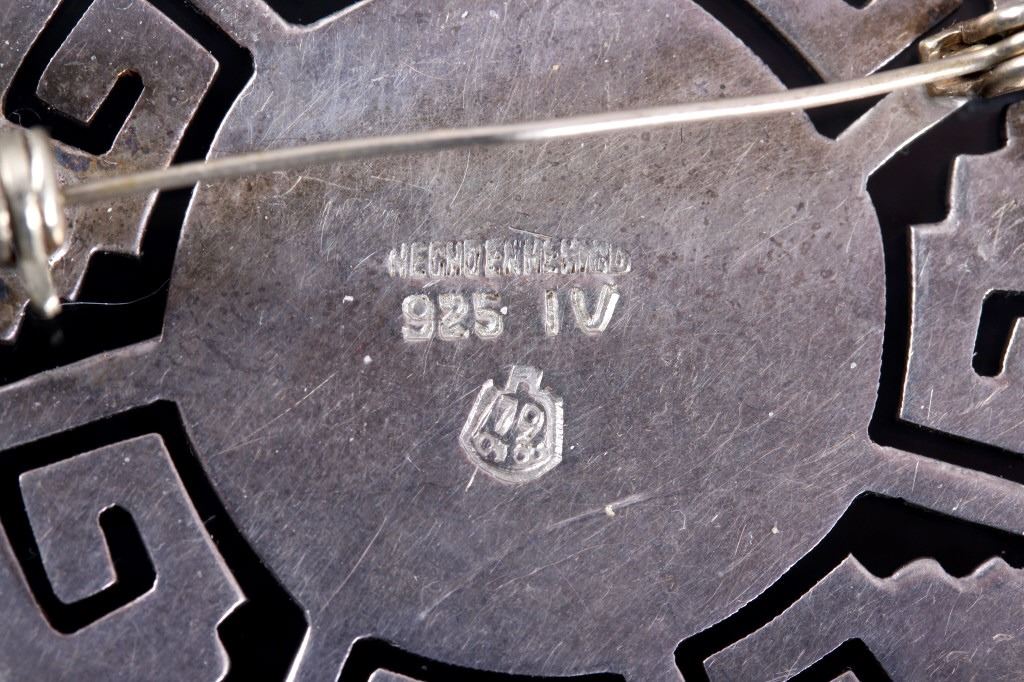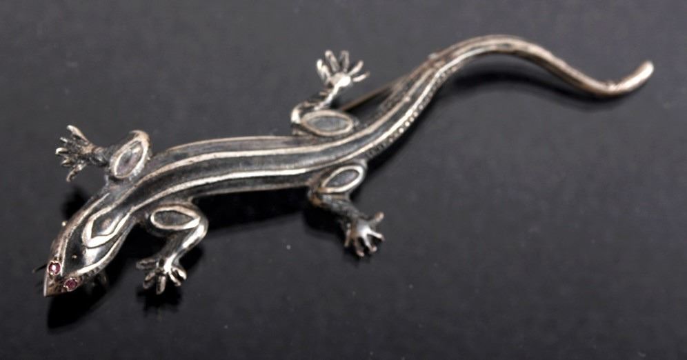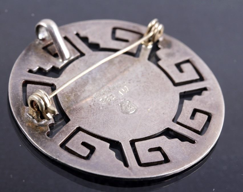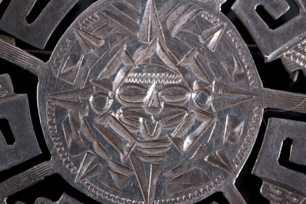 This lot features three brooches believed to be Sterling Silver. The first is a silver hand etched brooch or pendant with an Aztec warrior face in the center surrounded by a cut-out design. The back is marked "Hecho En Mexico/ 925/ IV" and has the "Eagle" form mark stamped with "79" on the breast. This Eagle mark was used from the mid 1950's through the 70's or 80's. The number likely refers to a city or silver manufacturing Company. It measures about 1 3/4" in diameter. The second brooch is a gecko having ruby red colored stone eyes and measuring 2.5" long. It is unmarked, but believed to be silver (untested). The third brooch is a Navajo sand cast silver and depicts five Navajo pots cleverly cast to look 3D. The brooch is unmarked, but an identical brooch found online is marked "Sterling" and has a hallmark for Thomas Singer. According to PuebloDirect.com, Tommy Singer (1940-2014) was a world famous Navajo Silversmith and had pioneered the technique of chip inlay while he was working with scrap turquoise stones. While this brooch has no inlay work, it does feature detailed design. The brooch measures 2" long by 1" tall. All three brooches are in very good condition.