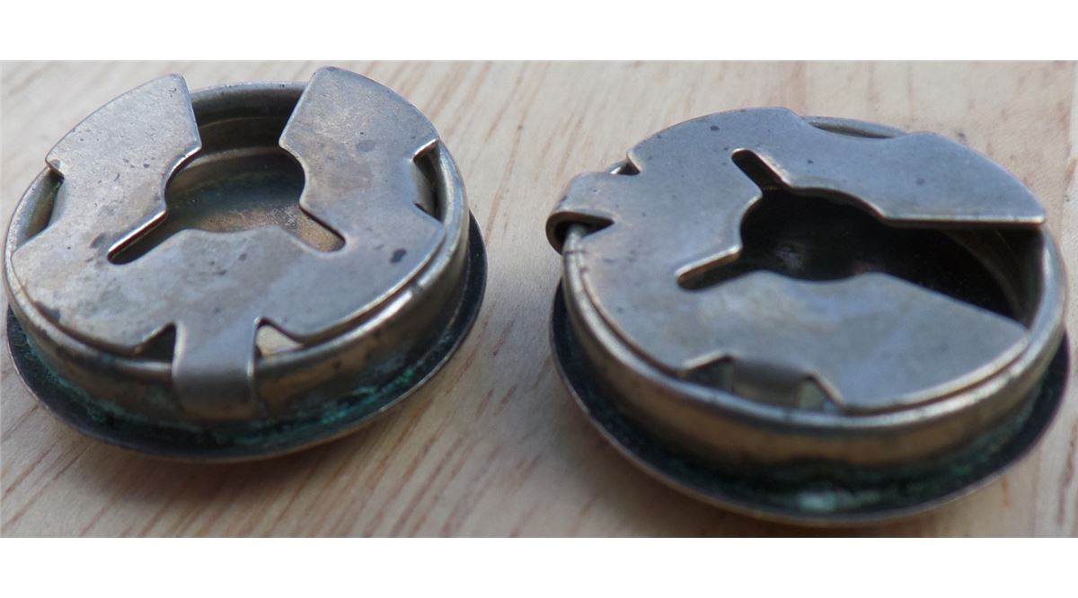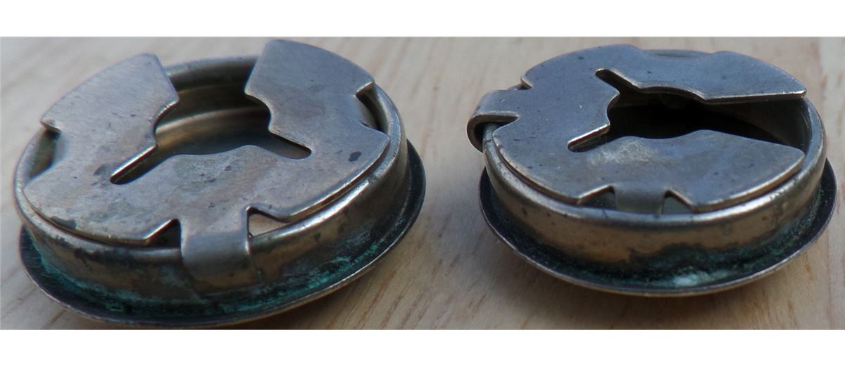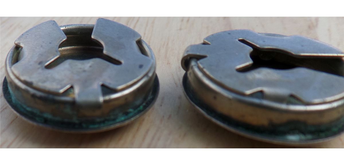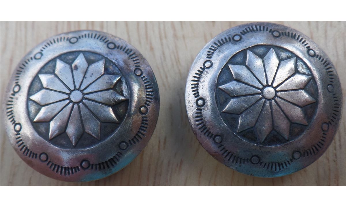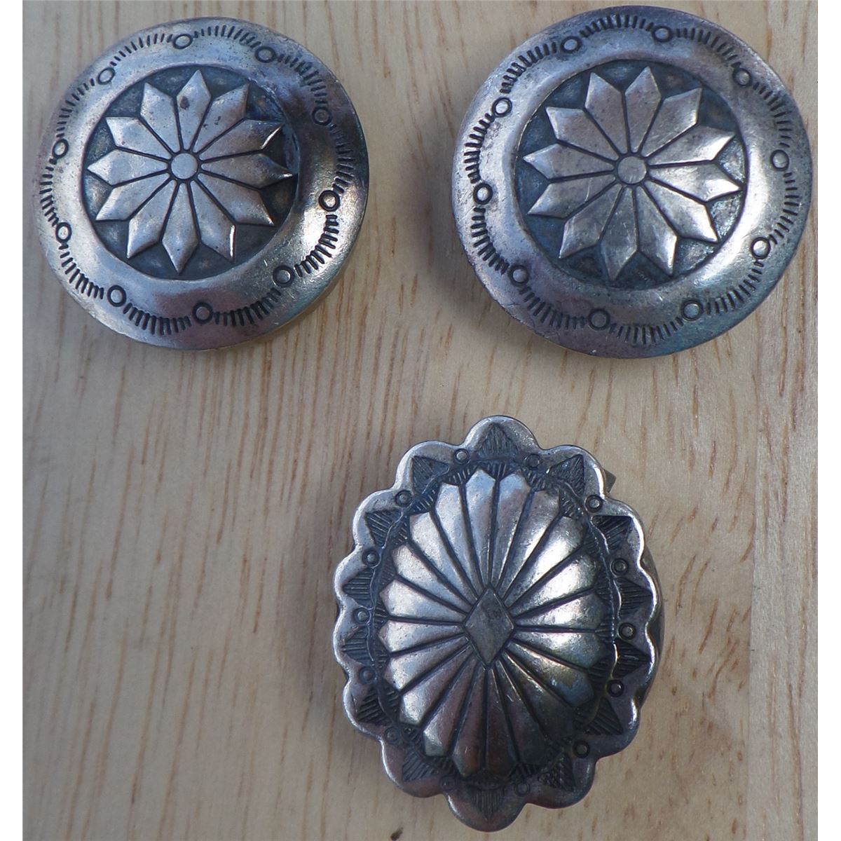 Three Sterling Silver button covers from the 1950's. The items weigh approximately 10.5 grams. Matching button covers have corrosion on edge. See images. Lot has two similar button cover and one single. Shipping $10.00