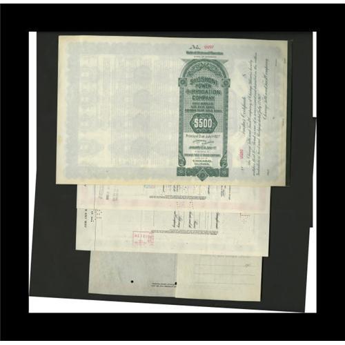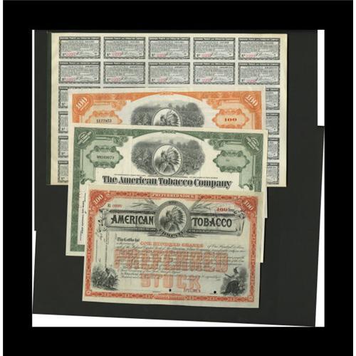 <B>Three Stock Certificates and a Bond.</B></I><BR>American Tobacco Co. Specimen Stock Certificate 190_ <B>AU,</B></I> PC<BR>American Tobacco Co. 60 Shares Stock Certificate <B>XF,</B></I> pinholes<BR>American Tobacco Co.100 Shares Stock Certificate <B>AU,</B></I> pinholes<BR></B></I>Shoshoni Power and Irrigation Co. - $500 Bond <B>CU,</B></I> 30 coupons.<BR><I>From The Troy Wiseman Collection</B></I>