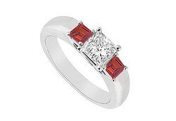 Two vibrant red rubies are prong-set beside a princess-cut diamond. These three stones are a symbol of your past present and the future. Made in 14K white gold this ring has a total gem weight (TGW) of 0.33 ct.
