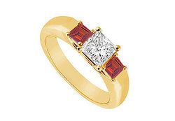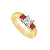 Two vibrant red rubies are prong-set beside a princess-cut diamond. These three stones are a symbol of your past present and the future. Made in 14K yellow gold this ring has a total gem weight (TGW) of 0.33 ct.