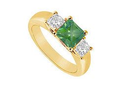 Two princess-cut diamonds are prong-set beside a vibrant green emerald. These three stones are a symbol of your past present and the future. Made in 14K yellow gold this ring has a total gem weight (TGW) of 0.50 ct.