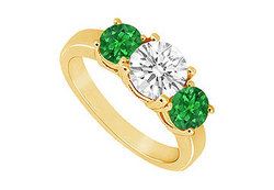 Two vibrant green emeralds are prong-set beside a brilliant-cut round diamond. These three stones are a symbol of your past present and the future. Made in 14K yellow gold this ring has a total gem weight (TGW) of 1.50 ct.