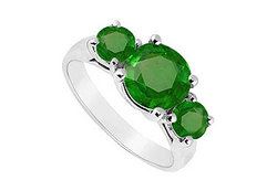 A bigger round lush green emerald is accented by two smaller emeralds on the sides. Made in 14K white gold this three stone ring has a total weight (TGW) of 2.50 ct.