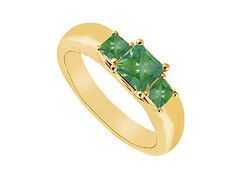Representing past present and future three princess-cut vibrant emeralds are prong-set in the center. Made in 14K yellow gold this three stone ring has a total weight (TDW) of 0.25 ct.