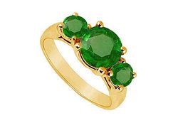 A bigger round lush green emerald is accented by two smaller emeralds on the sides. Made in 14K yellow gold this three stone ring has a total weight (TGW) of 2.00 ct.