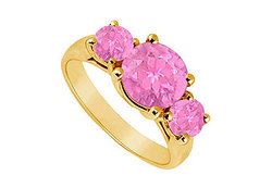 A bigger round vibrant pink sapphire is accented by two smaller pink sapphires on the sides. Made in 14K yellow gold this three stone ring has a total weight (TGW) of 2.50 ct.