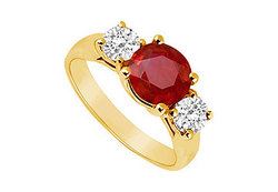Two brilliant-cut round diamonds are prong-set beside a vibrant red ruby. These three stones are a symbol of your past present and the future. Made in 14K yellow gold this ring has a total gem weight (TGW) of 1.75 ct.