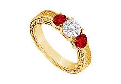 A brilliant-cut round diamond is set between two radiant rubies. The band is intricately designed in 14K yellow gold. This three stone ring has a total weight (TGW) of 0.33 ct.