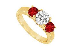Two vibrant red rubies are prong-set beside a brilliant-cut round diamond. These three stones are a symbol of your past present and the future. Made in 14K yellow gold this ring has a total gem weight (TGW) of 1.00 ct.