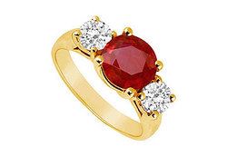 Two brilliant-cut round diamonds are prong-set beside a vibrant red ruby. These three stones are a symbol of your past present and the future. Made in 14K yellow gold this ring has a total gem weight (TGW) of 2.50 ct.