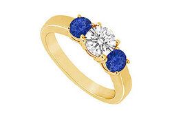Two cool blue sapphires are prong-set beside a brilliant-cut round diamond. These three stones are a symbol of your past present and the future. Made in 14K yellow gold this ring has a total gem weight (TGW) of 0.33 ct.