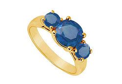A bigger round cool blue sapphire is accented by two smaller sapphires on the sides. Made in 14K yellow gold this three stone ring has a total weight (TGW) of 1.75 ct.