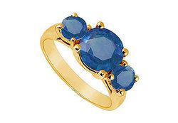 A bigger round cool blue sapphire is accented by two smaller sapphires on the sides. Made in 14K yellow gold this three stone ring has a total weight (TGW) of 3.00 ct.