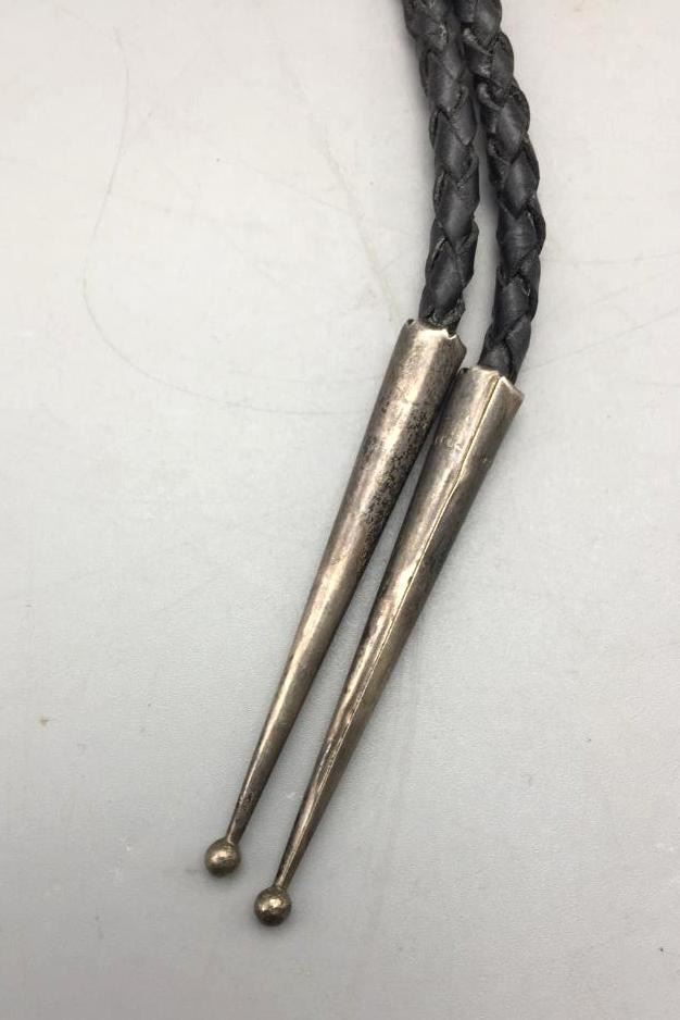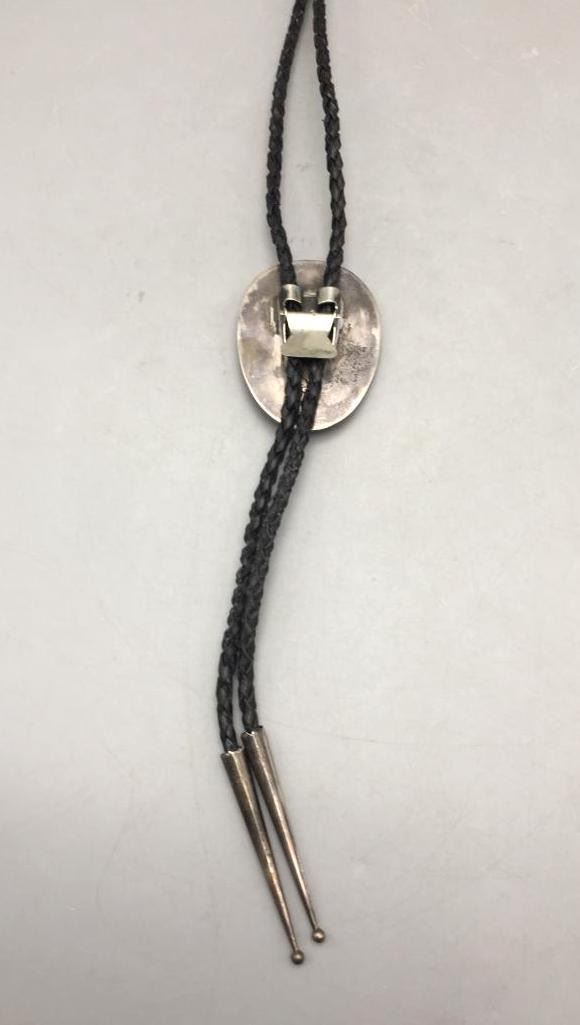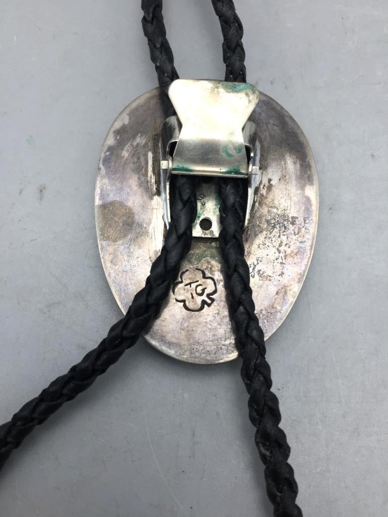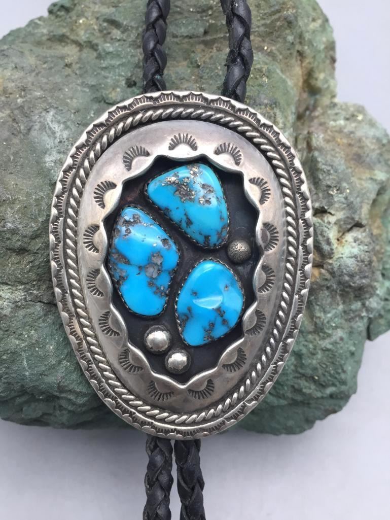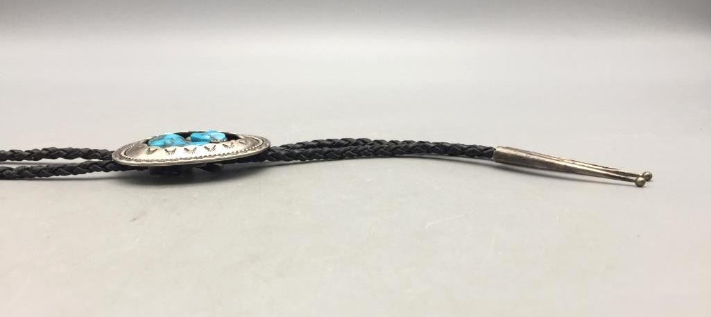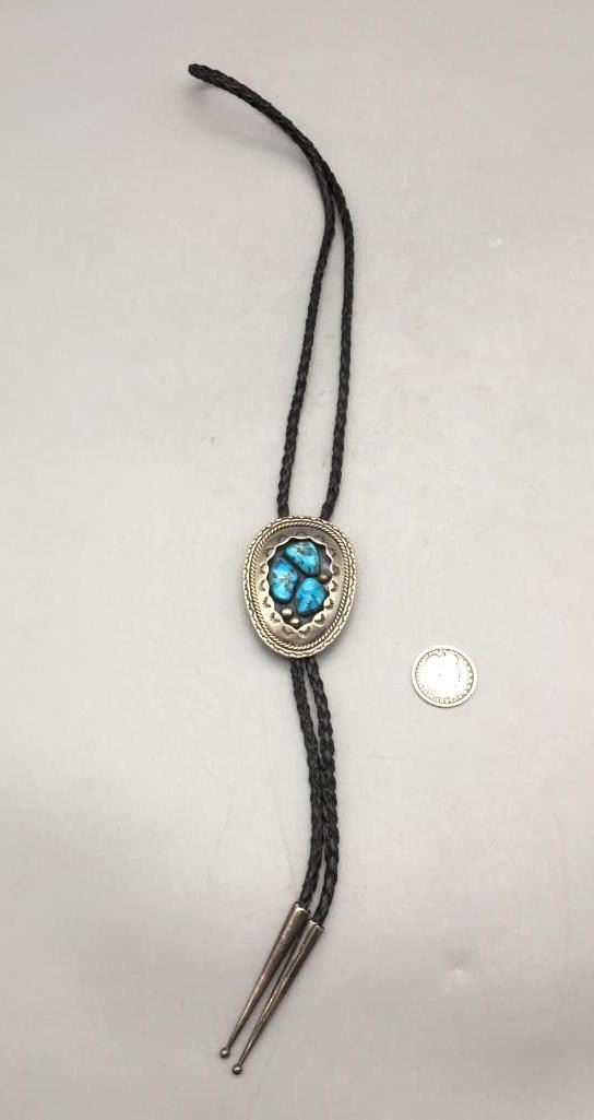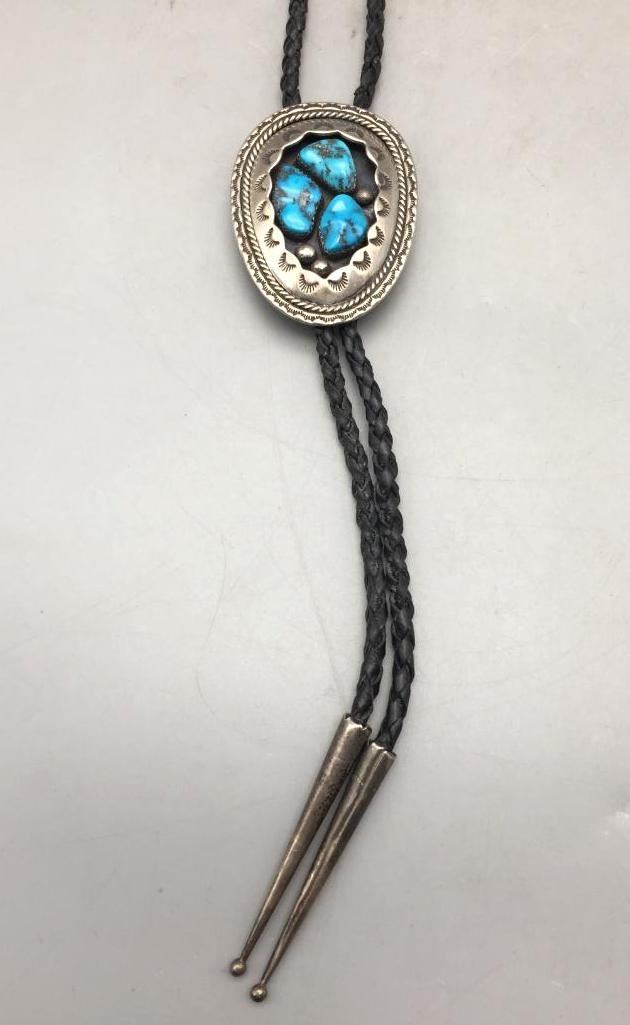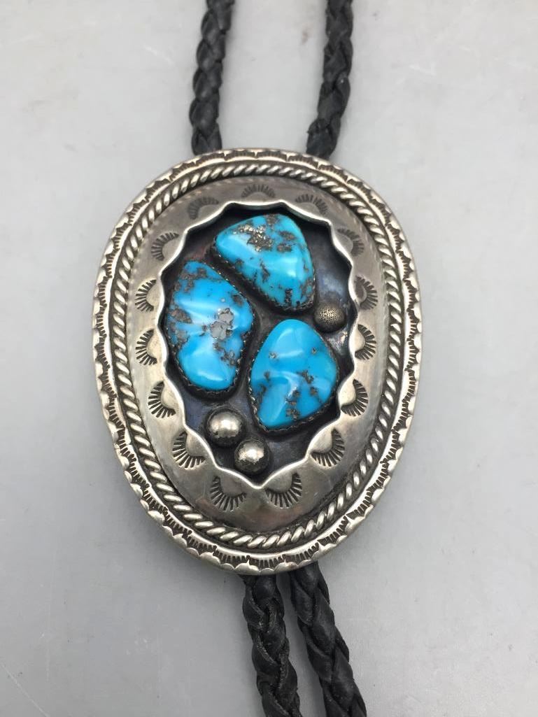 Presented for sale in this lot is this three stone turquoise bolo tie by Teddy Goodluck Jr. It is set with three nice turquoise cabochons in a shadow box setting. It has stamp work around the stones and is sterling silver. Maker: Teddy Goodluck Jr. (1956-; Navajo). Approx. Age: Vintage. Size: Braided cord measure 38" long including tips. Slide measures 2-3/8" long X 1-3/4" wide. Weighs 45.6 grams. Condition: Good for its age, normal wear expected. Please look closely at the pictures - they are an important part of our description. Shipping: There will be a $5 handling, packaging fee for shipping this lot. The actual cost of postage will be added on top of that.