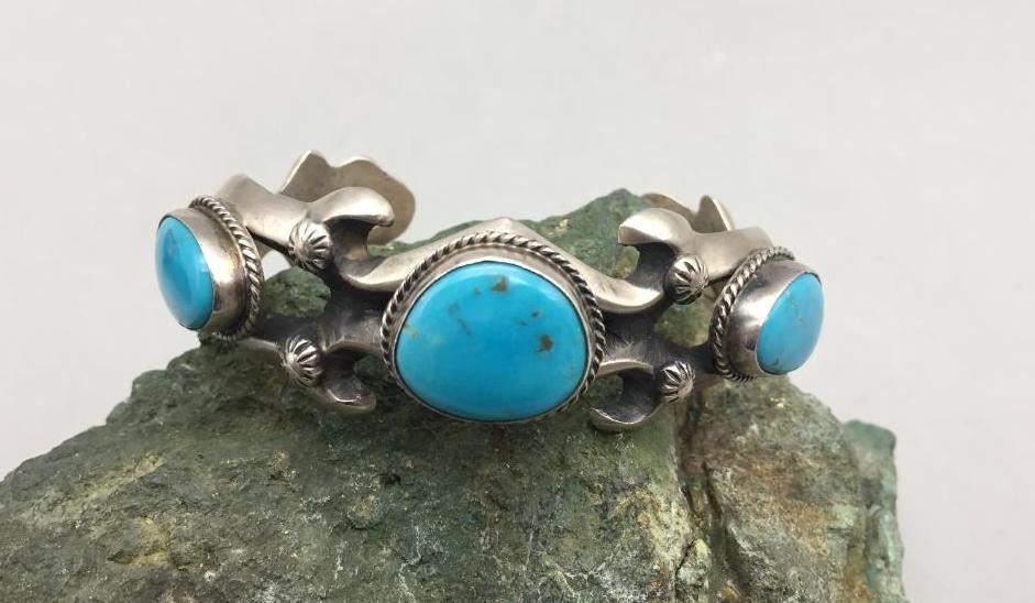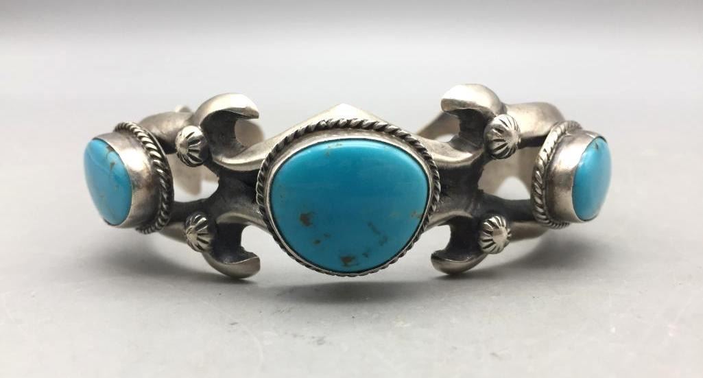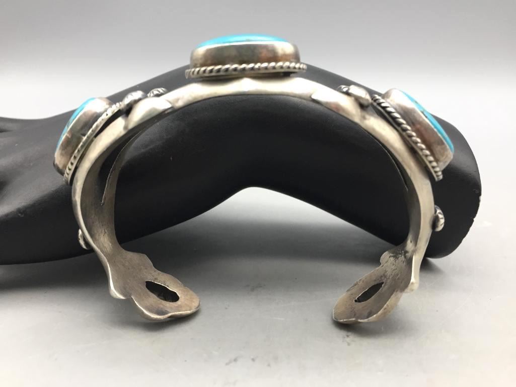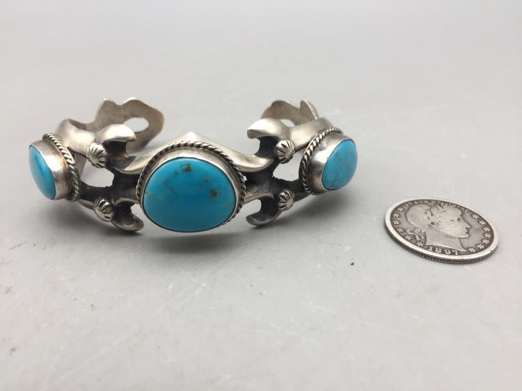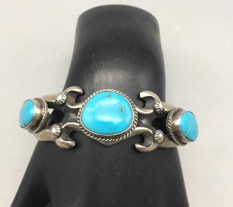 Offered for sale in this lot is a beautiful sterling silver bracelet featuring three gorgeous turquoise stones. Maker: Hallmarked Perry. Approx. Age: Modern. Size: Measures 5-3/4" with a 1-1/8" opening, fits a 6-7/8" wrist. It is 1" wide and weighs 64.1 grams. Condition: Good for its age, normal wear expected. Please look closely at the pictures - they are an important part of our description. Shipping: There will be a $5 handling / packaging fee for shipping this lot. The actual cost of postage will be added on top of that.