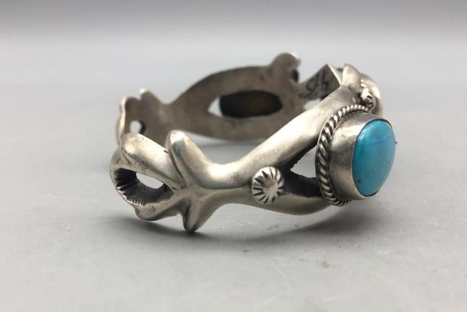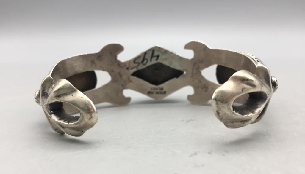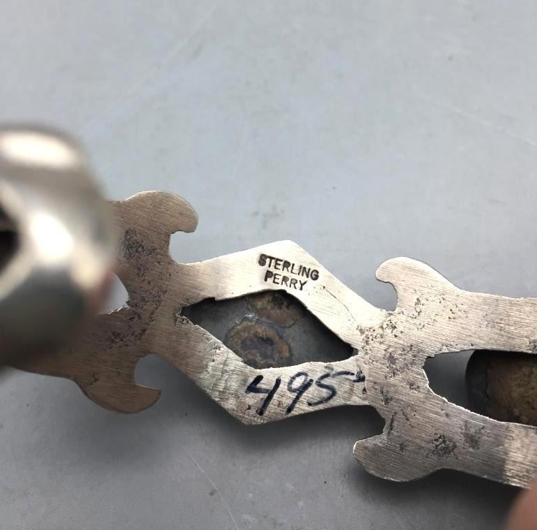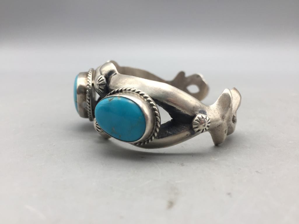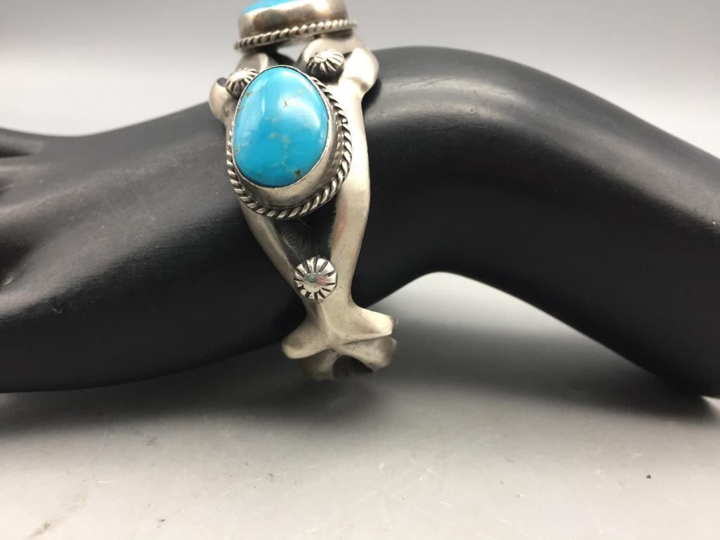 Offered for sale in this lot is a beautiful sterling silver bracelet featuring three gorgeous turquoise stones. Maker: Hallmarked Perry. Approx. Age: Modern. Size: Measures 5-3/4" with a 1-1/8" opening, fits a 6-7/8" wrist. It is 1" wide and weighs 64.1 grams. Condition: Good for its age, normal wear expected. Please look closely at the pictures - they are an important part of our description. Shipping: There will be a $5 handling / packaging fee for shipping this lot. The actual cost of postage will be added on top of that.