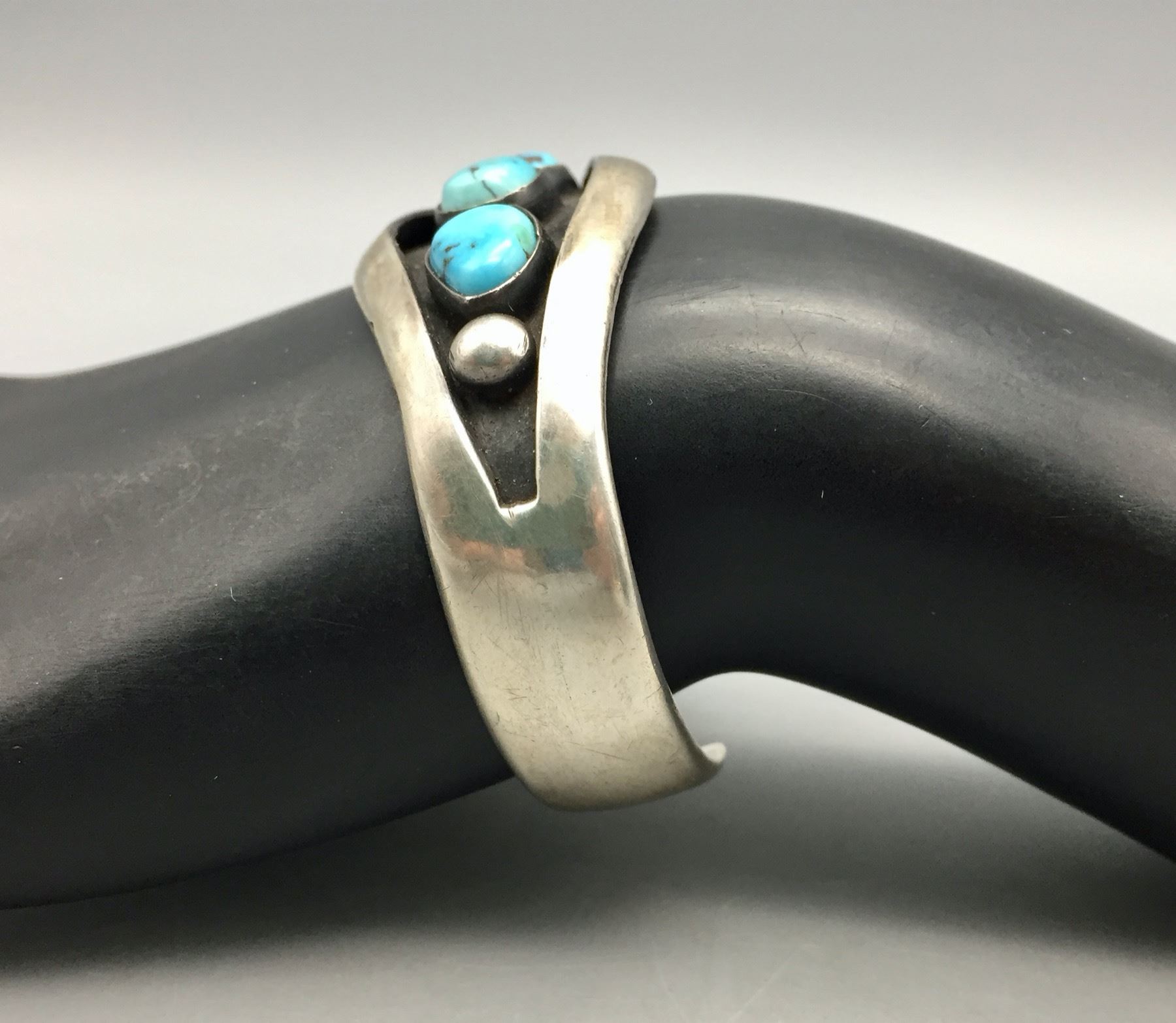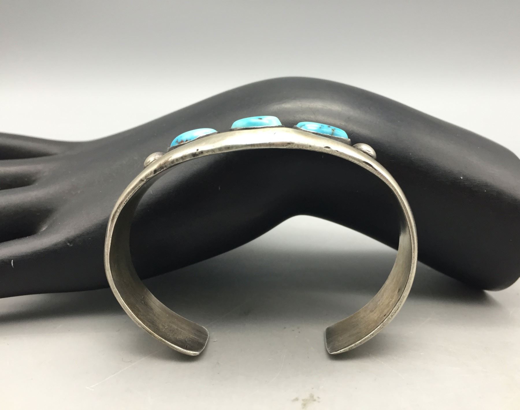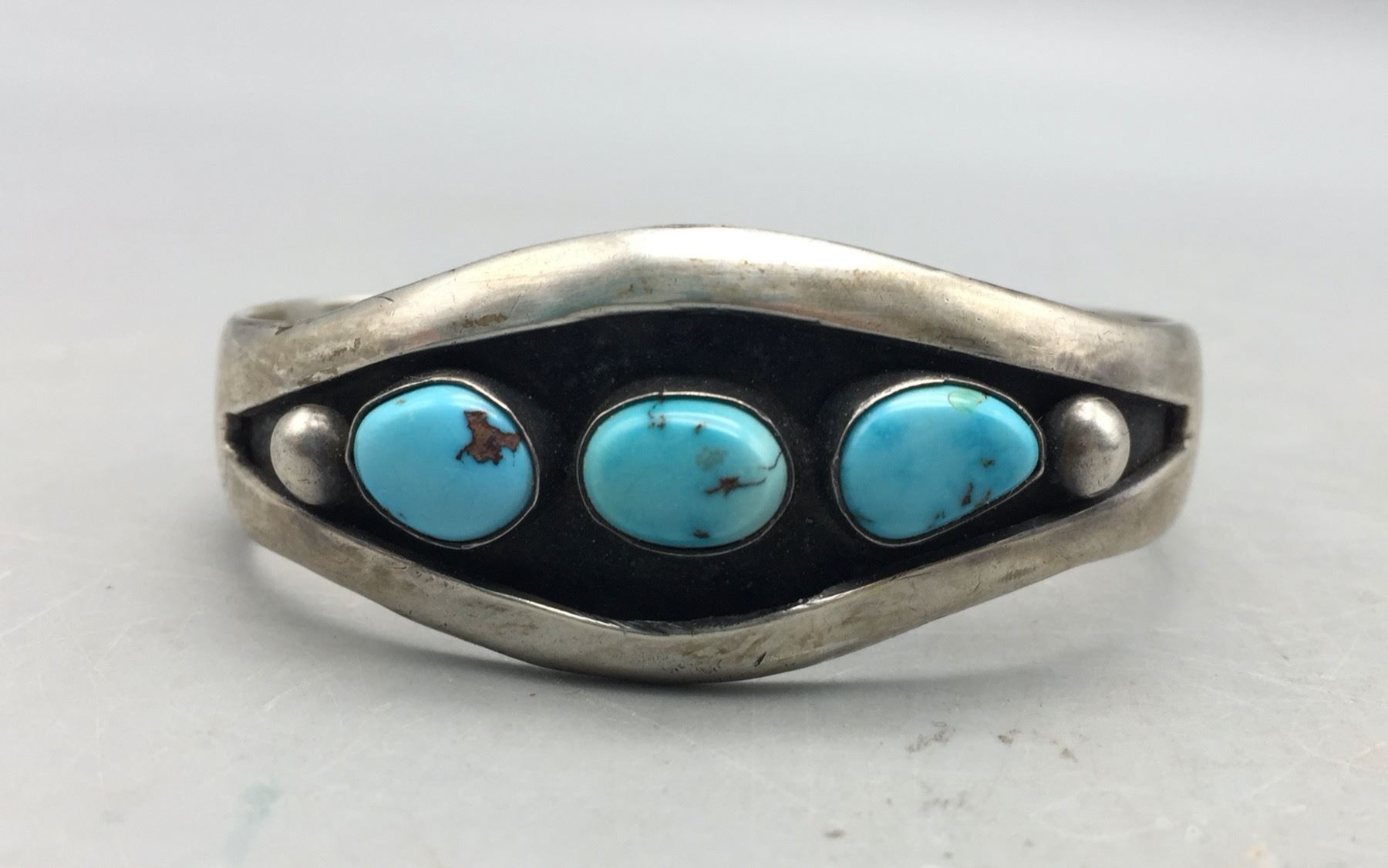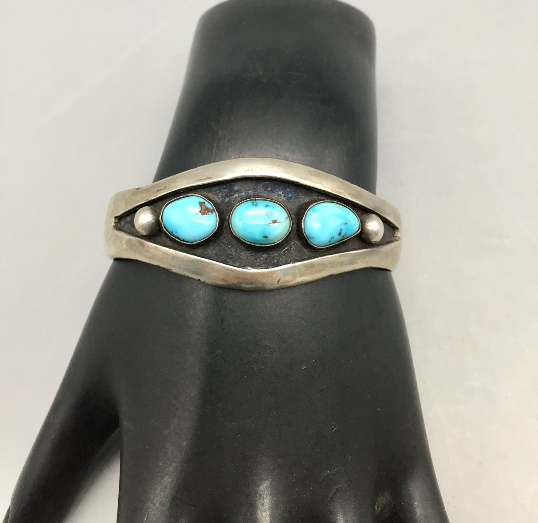 Description: Presented for sale in this lot is a beautiful three turquoise stone bracelet with a shadowbox like design. It is a well made sterling silver bracelet. Maker: Unknown. Approx. Age: Vintage. Size: Inside circumference measures 5-3/8†long. Opening is additional 1â€, fitting a 6-3/8â€. Width is 1â€. Weighs 32.4 grams. Condition: Good for its age, normal wear expected. Please look closely at the pictures - they are an important part of our description. Shipping: There will be a $5 handling / packaging fee for shipping this lot. The actual cost of postage will be added on top of that.