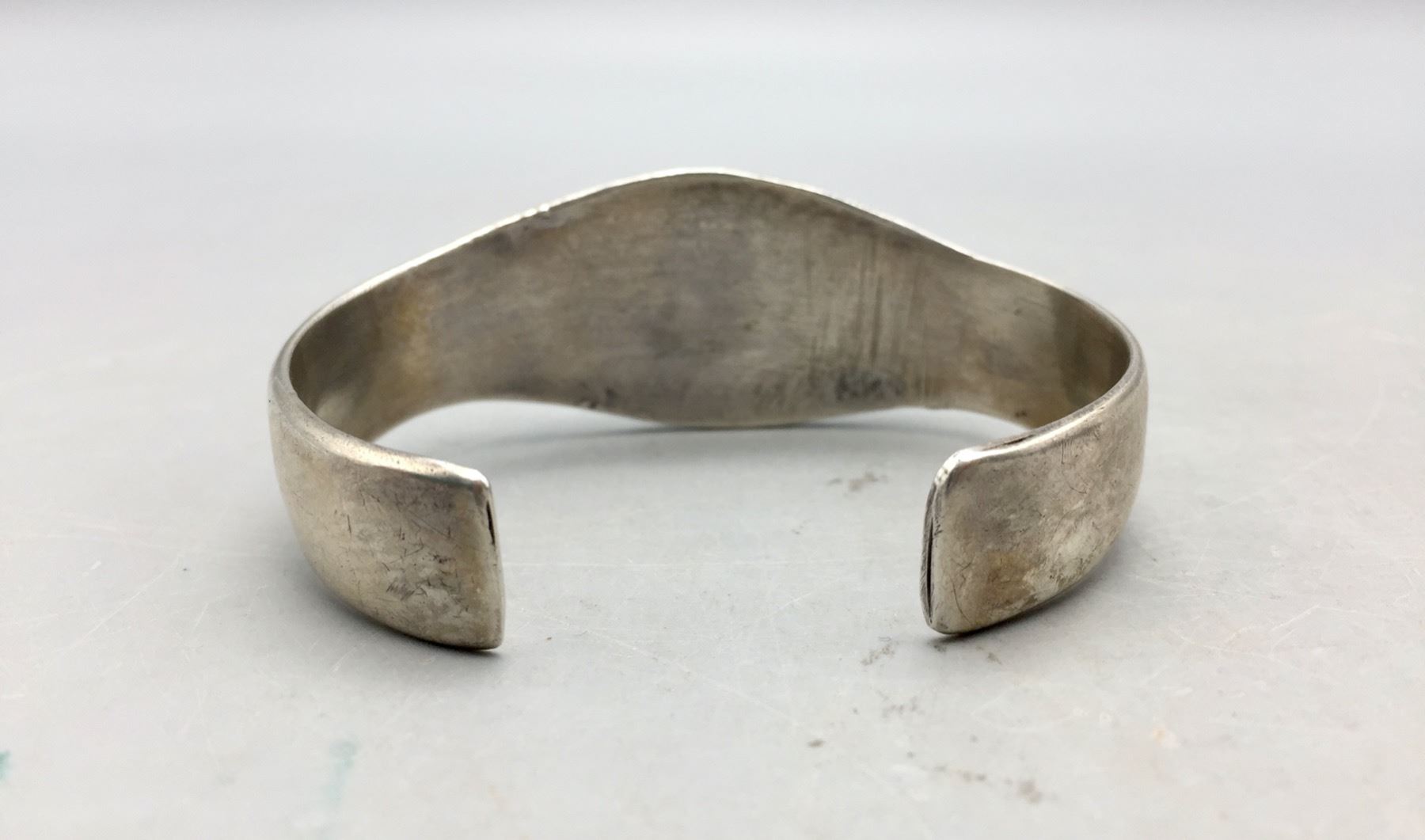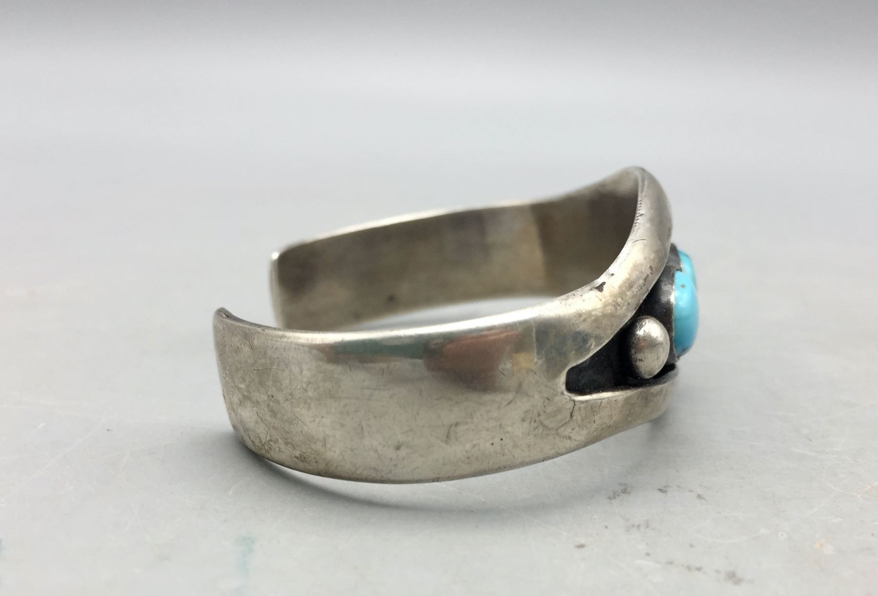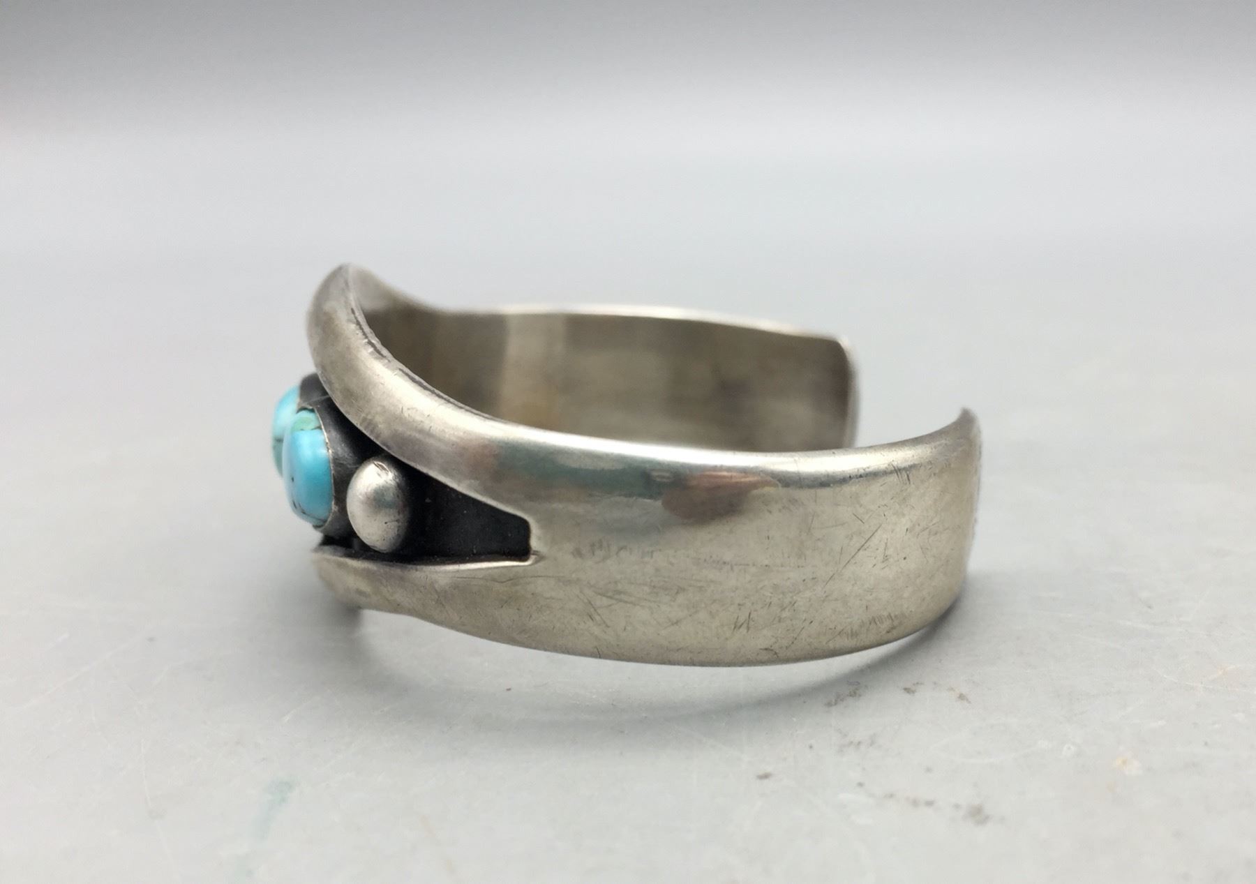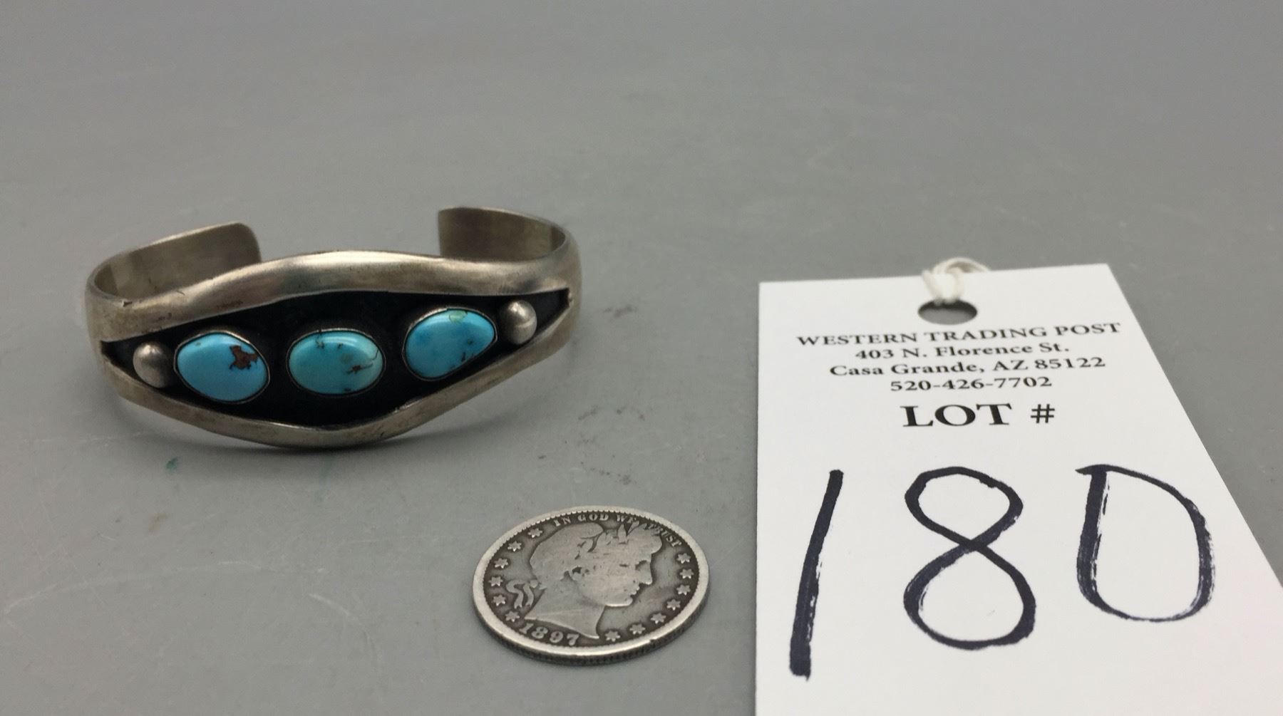 Description: Presented for sale in this lot is a beautiful three turquoise stone bracelet with a shadowbox like design. It is a well made sterling silver bracelet. Maker: Unknown. Approx. Age: Vintage. Size: Inside circumference measures 5-3/8†long. Opening is additional 1â€, fitting a 6-3/8â€. Width is 1â€. Weighs 32.4 grams. Condition: Good for its age, normal wear expected. Please look closely at the pictures - they are an important part of our description. Shipping: There will be a $5 handling / packaging fee for shipping this lot. The actual cost of postage will be added on top of that.