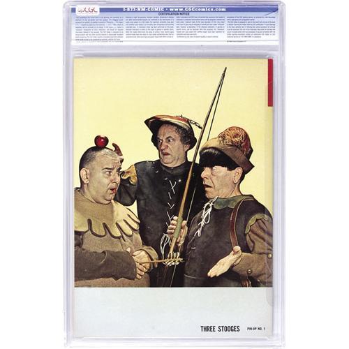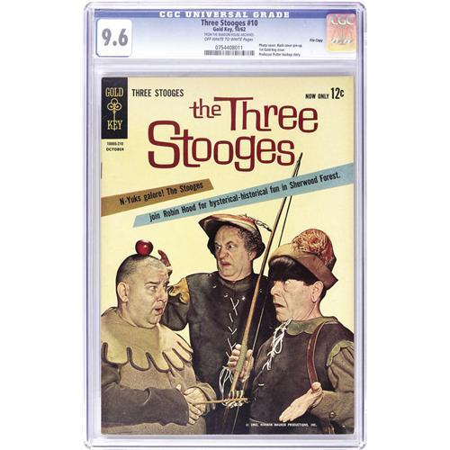 <B>Three Stooges #10 File Copy (Gold Key, 1962) CGC NM+ 9.6 Off-white to white pages.</B></I> This was the first Gold Key issue for those Emirs of the Eye-Gouge, the Three Stooges. Overstreet 2006 NM- 9.2 value = $170. CGC census 5/06: 5 in 9.6, none higher. <I>From the Random House Archives.</B></I> <BR><BR><B>Important notice:</B> Heritage usually auctions material at the rate of 200-250 lots per hour. On some occasions eBay Live bid software or the Internet may not be able to keep up with the pace of the auction. We recommend placing a realistic absentee bid now as insurance to avoid disappointment. Occasionally the auctioneer may eliminate or reject an eBay Live bid, and the auctioneer may also reopen a lot after the close of the eBay live bidding (usually because we missed an audience bid), and may reject your bid even if it shows you as the winning bidder. By bidding via eBay Live, you agree that Heritage may award the lot to another bidder at its sole discretion under the circumstances described above or any other reasonable circumstances. Since eBay bids are not shown to us until we open the lot on the floor, we treat those bids just like floor bids. In most cases the floor responds before the eBay bid is presented to us, due to Internet lag time, so for consistency we have made it a policy that floor bids are always considered first over tie eBay live bids. Also please note that all Heritage lots purchased through eBay Live carry a 22.5% Buyer's Premium. Please make sure you read the Terms and Conditions before you bid. This lot is being auctioned in conjunction with a live floor auction by Heritage Auction Galleries. All final auction and invoice information will be supplied by Heritage Auction Galleries, and all other information should be considered preliminary. Lot:41001 <BR><BR><B>Winning Notification and Billing:</B> After the FINAL session in this auction is complete, Heritage will send e-mail and snail mail invoices. This process normally takes several days. All final auction and invoice information will be supplied by Heritage Auction Galleries, and all other information should be considered preliminary. <BR><BR>This auction will be conducted on a live auction floor and over the Internet through eBay Live. If you choose to place an absentee bid, please take a moment to <font color='#0000ff'><u><a href='http://pages.ebay.com/liveauctions/help/before/laabsentee.html'>learn how eBay Live absentee bidding works</a></u></font><font color='#000000'>