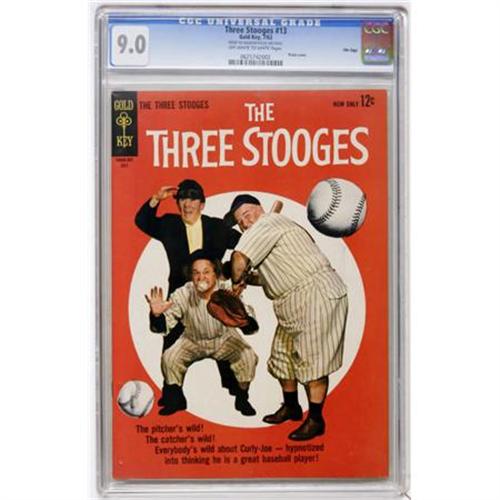 <B>Three Stooges #13 File Copy (Gold Key, 1963) CGC VF/NM 9.0 Off-white to white pages.</B></I> Photo cover. CGC notes, "From the Random House Archives." Overstreet 2007 VF/NM 9.0 value = $110; NM- 9.2 value = $150. CGC census 9/07: 5 in 9.0, 4 higher.<BR><BR><b>Shipping:</b> Comics - Slabbed (certified) (<a target="_blank" href="http://www.heritageauctions.com/common/shipping.php">view shipping information</a>)