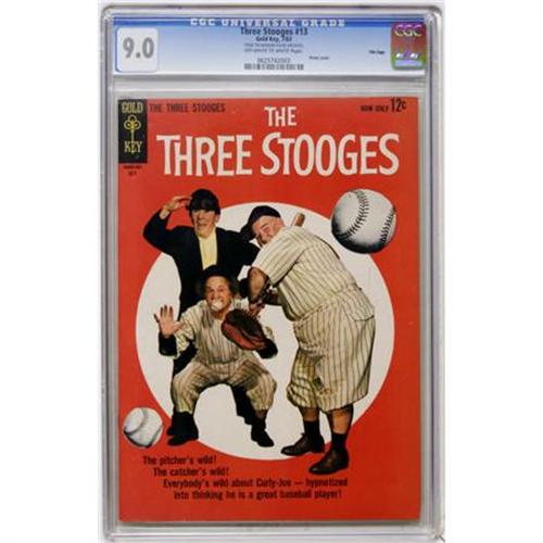 <B>Three Stooges #13 File Copy (Gold Key, 1963) CGC VF/NM 9.0 Off-white to white pages.</B></I> Photo cover. CGC notes, "From the Random House Archives." Overstreet 2007 VF/NM 9.0 value = $110; NM- 9.2 value = $150. CGC census 10/07: 5 in 9.0, 4 higher.<BR><BR><b>Shipping:</b> Comics - Slabbed (certified) (<a target="_blank" href="http://www.heritageauctions.com/common/shipping.php">view shipping information</a>)