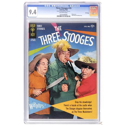<B>Three Stooges #19 File Copy (Gold Key, 1964) CGC NM 9.4 Off-white pages.</B></I> Photo cover. Little Monsters backup story. Overstreet 2006 NM- 9.2 value = $140. CGC census 5/06: 4 in 9.4, none higher. <I>From the Random House Archives.</B></I> <BR><BR><B>Important notice:</B> Heritage usually auctions material at the rate of 200-250 lots per hour. On some occasions eBay Live bid software or the Internet may not be able to keep up with the pace of the auction. We recommend placing a realistic absentee bid now as insurance to avoid disappointment. Occasionally the auctioneer may eliminate or reject an eBay Live bid, and the auctioneer may also reopen a lot after the close of the eBay live bidding (usually because we missed an audience bid), and may reject your bid even if it shows you as the winning bidder. By bidding via eBay Live, you agree that Heritage may award the lot to another bidder at its sole discretion under the circumstances described above or any other reasonable circumstances. Since eBay bids are not shown to us until we open the lot on the floor, we treat those bids just like floor bids. In most cases the floor responds before the eBay bid is presented to us, due to Internet lag time, so for consistency we have made it a policy that floor bids are always considered first over tie eBay live bids. Also please note that all Heritage lots purchased through eBay Live carry a 22.5% Buyer's Premium. Please make sure you read the Terms and Conditions before you bid. This lot is being auctioned in conjunction with a live floor auction by Heritage Auction Galleries. All final auction and invoice information will be supplied by Heritage Auction Galleries, and all other information should be considered preliminary. Lot:41001 <BR><BR><B>Winning Notification and Billing:</B> After the FINAL session in this auction is complete, Heritage will send e-mail and snail mail invoices. This process normally takes several days. All final auction and invoice information will be supplied by Heritage Auction Galleries, and all other information should be considered preliminary. <BR><BR>This auction will be conducted on a live auction floor and over the Internet through eBay Live. If you choose to place an absentee bid, please take a moment to <font color='#0000ff'><u><a href='http://pages.ebay.com/liveauctions/help/before/laabsentee.html'>learn how eBay Live absentee bidding works</a></u></font><font color='#000000'>