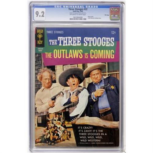 <B>Three Stooges #22 File Copy (Gold Key, 1965) CGC NM- 9.2 Off-white to white pages.</B></I> Movie scenes from "The Outlaws Is Coming" featured. Photo cover. Little Monsters backup story. CGC notes, "From the Random House Archives." Overstreet 2007 NM- 9.2 value = $135. CGC census 9/07: 3 in 9.2, 8 higher.<BR><BR><b>Shipping:</b> Comics - Slabbed (certified) (<a target="_blank" href="http://www.heritageauctions.com/common/shipping.php">view shipping information</a>)