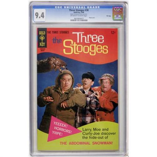 <B>Three Stooges #38 File Copy (Gold Key, 1968) CGC NM 9.4 Off-white to white pages.</B></I> Photo cover. CGC notes, "From the Random House Archives." Overstreet 2007 NM- 9.2 value = $90. CGC census 10/07: 7 in 9.4, none higher.<BR><BR><b>Shipping:</b> Comics - Slabbed (certified) (<a target="_blank" href="http://www.heritageauctions.com/common/shipping.php">view shipping information</a>)