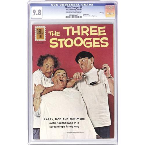 <B>Three Stooges #6 File Copy (Dell, 1961) CGC NM/MT 9.8 Off-white to white pages.</B></I> When you show your Stooge-collecting friends that you have the sole highest-graded copy, it'll be like an eye-poke to the face of those wise guys! Overstreet 2006 NM- 9.2 value = $170. CGC census 5/06: 1 in 9.8, none higher. <I>From the Random House Archives.</B></I> <BR><BR><B>Important notice:</B> Heritage usually auctions material at the rate of 200-250 lots per hour. On some occasions eBay Live bid software or the Internet may not be able to keep up with the pace of the auction. We recommend placing a realistic absentee bid now as insurance to avoid disappointment. Occasionally the auctioneer may eliminate or reject an eBay Live bid, and the auctioneer may also reopen a lot after the close of the eBay live bidding (usually because we missed an audience bid), and may reject your bid even if it shows you as the winning bidder. By bidding via eBay Live, you agree that Heritage may award the lot to another bidder at its sole discretion under the circumstances described above or any other reasonable circumstances. Since eBay bids are not shown to us until we open the lot on the floor, we treat those bids just like floor bids. In most cases the floor responds before the eBay bid is presented to us, due to Internet lag time, so for consistency we have made it a policy that floor bids are always considered first over tie eBay live bids. Also please note that all Heritage lots purchased through eBay Live carry a 22.5% Buyer's Premium. Please make sure you read the Terms and Conditions before you bid. This lot is being auctioned in conjunction with a live floor auction by Heritage Auction Galleries. All final auction and invoice information will be supplied by Heritage Auction Galleries, and all other information should be considered preliminary. Lot:41001 <BR><BR><B>Winning Notification and Billing:</B> After the FINAL session in this auction is complete, Heritage will send e-mail and snail mail invoices. This process normally takes several days. All final auction and invoice information will be supplied by Heritage Auction Galleries, and all other information should be considered preliminary. <BR><BR>This auction will be conducted on a live auction floor and over the Internet through eBay Live. If you choose to place an absentee bid, please take a moment to <font color='#0000ff'><u><a href='http://pages.ebay.com/liveauctions/help/before/laabsentee.html'>learn how eBay Live absentee bidding works</a></u></font><font color='#000000'>