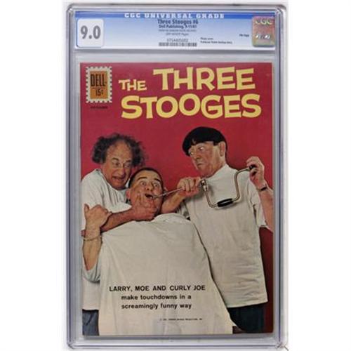 <B>Three Stooges #6 File Copy (Dell, 1961) CGC VF/NM 9.0 Off-white pages.</B></I> Photo cover. CGC notes, "From the Random House Archives." Overstreet 2007 VF/NM 9.0 value = $130; NM- 9.2 value = $180. CGC census 9/07: 1 in 9.0, 17 higher.<BR><BR><b>Shipping:</b> Comics - Slabbed (certified) (<a target="_blank" href="http://www.heritageauctions.com/common/shipping.php">view shipping information</a>)